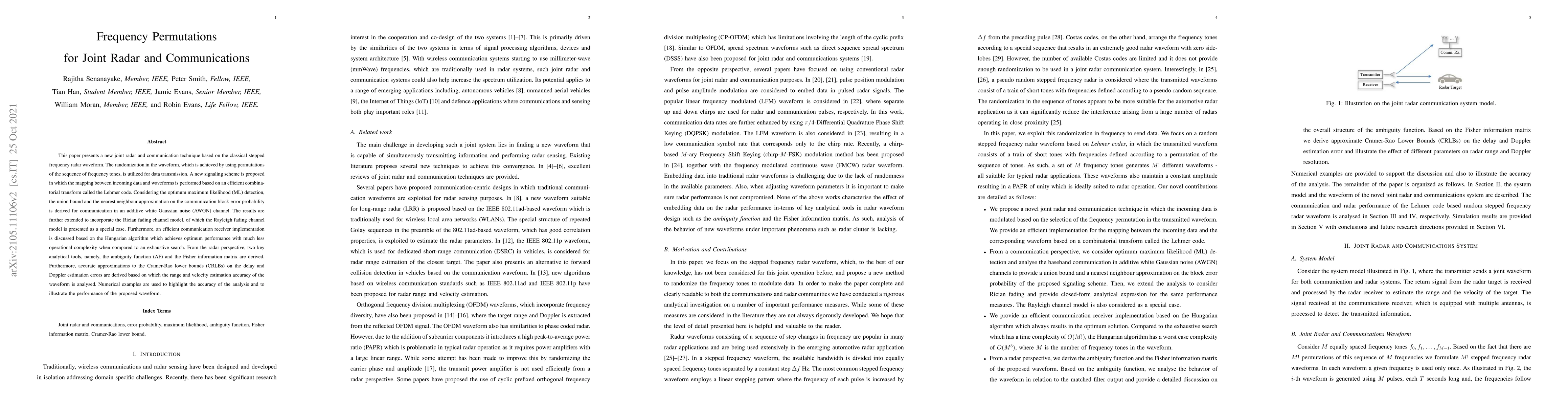 This paper presents a new joint radar and communication technique based on the classical stepped frequency radar waveform. The randomization in the waveform, which is achieved by using permutations of the sequence of frequency tones, is utilized for data transmission. A new signaling scheme is proposed in which the mapping between incoming data and waveforms is performed based on an efficient combinatorial transform called the Lehmer code. Considering the optimum maximum likelihood (ML) detection, the union bound and the nearest neighbour approximation on the communication block error probability is derived for communication in an additive white Gaussian noise (AWGN) channel. The results are further extended to incorporate the Rician fading channel model, of which the Rayleigh fading channel model is presented as a special case. Furthermore, an efficient communication receiver implementation is discussed based on the Hungarian algorithm which achieves optimum performance with much less operational complexity when compared to an exhaustive search. From the radar perspective, two key analytical tools, namely, the ambiguity function (AF) and the Fisher information matrix are derived. Furthermore, accurate approximations to the Cramer-Rao lower bounds (CRLBs) on the delay and Doppler estimation errors are derived based on which the range and velocity estimation accuracy of the waveform is analysed. Numerical examples are used to highlight the accuracy of the analysis and to illustrate the performance of the proposed waveform.