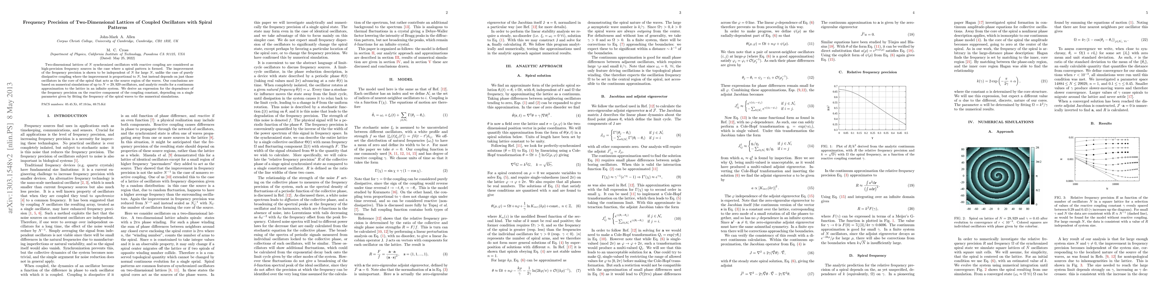 Two-dimensional lattices of synchronized oscillators with reactive coupling can achieve high frequency precision in spiral patterns, independent of the number of oscillators, unlike purely dissipative coupling.