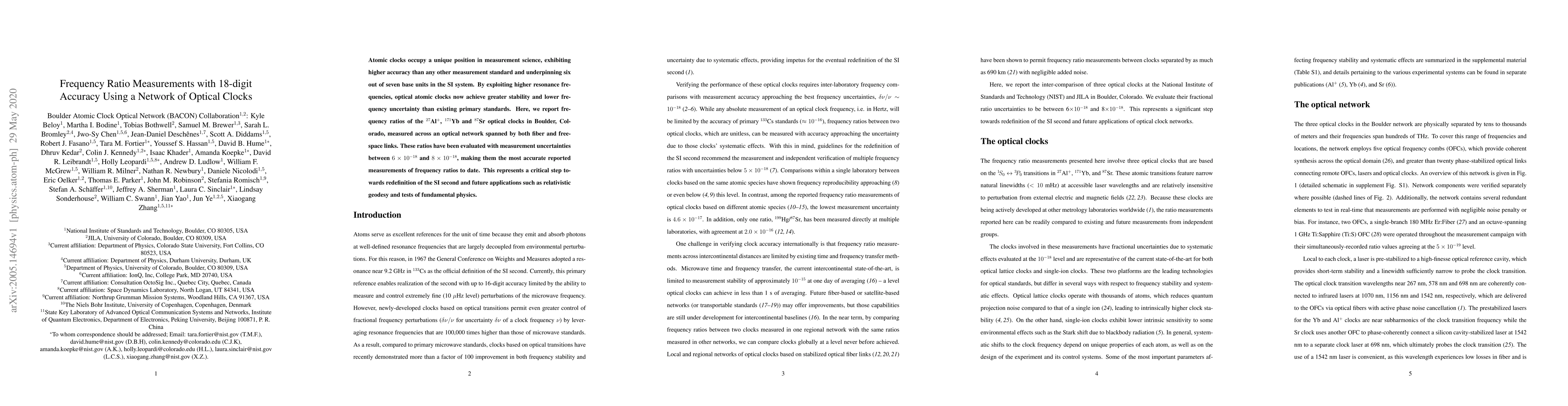 This paper reports highly accurate frequency ratio measurements between $^{27}$Al$^+$, $^{171}$Yb, and $^{87}$Sr optical clocks using a network of optical clocks in Boulder, Colorado, achieving unprecedented accuracy of 18-digit precision. These measurements are crucial for redefining the SI second and advancing applications in relativistic geodesy and fundamental physics.