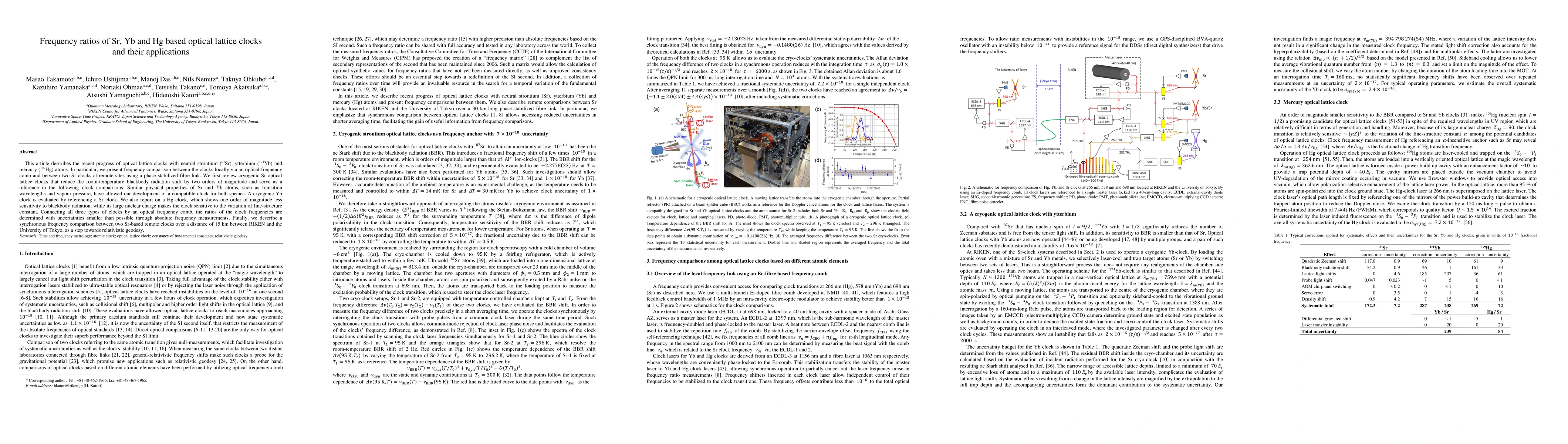 This paper reviews advancements in optical lattice clocks using $^{87}$Sr, $^{171}$Yb, and $^{199}$Hg atoms, detailing frequency comparisons and applications, including a remote Sr clock comparison over 15 km. The study highlights the significant reduction in blackbody radiation shifts in cryogenic Sr clocks and the development of a compatible Yb clock, while also noting Hg clock's sensitivity to the fine-structure constant.