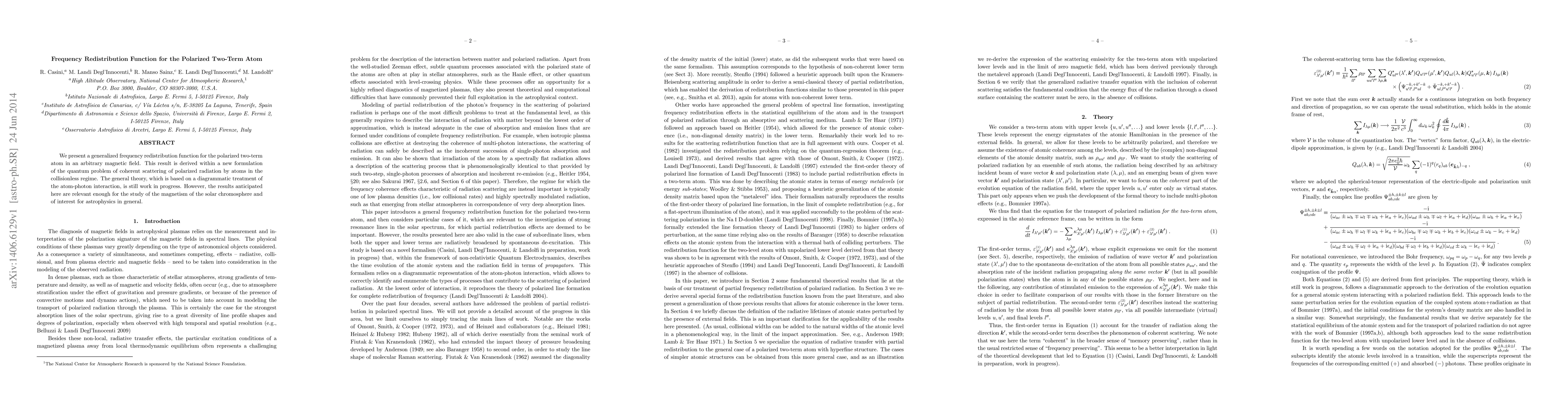 We present a generalized frequency redistribution function for the polarized two-term atom in an arbitrary magnetic field. This result is derived within a new formulation of the quantum problem of coherent scattering of polarized radiation by atoms in the collisionless regime. The general theory, which is based on a diagrammatic treatment of the atom-photon interaction, is still work in progress. However, the results anticipated here are relevant enough for the study of the magnetism of the solar chromosphere and of interest for astrophysics in general.