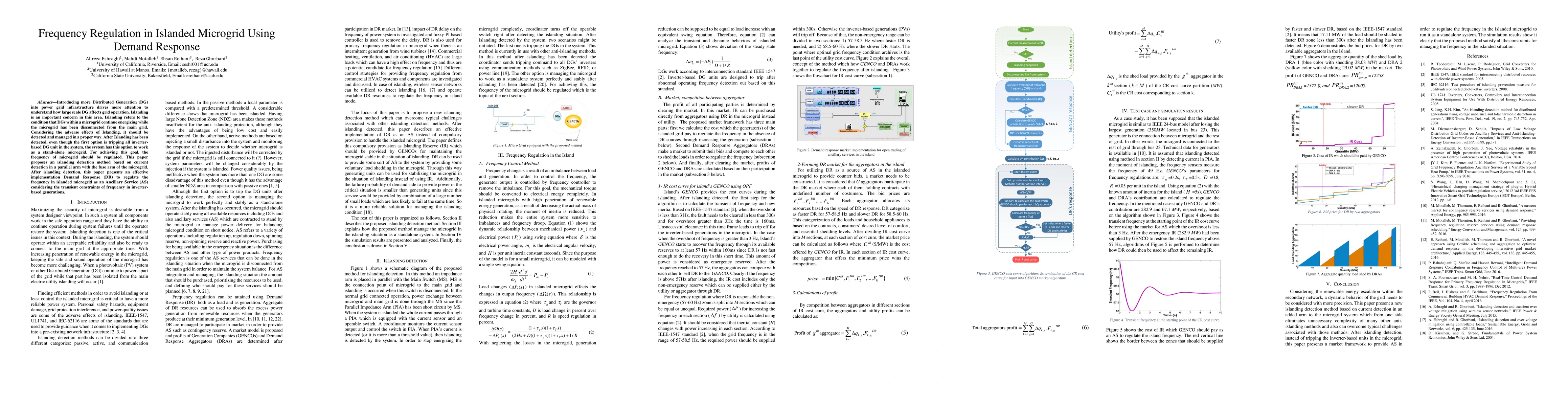 This paper proposes an islanding detection method for microgrids using current detection and implements Demand Response (DR) as an Ancillary Service (AS) to regulate frequency after islanding, addressing transient constraints of inverter-based generations.