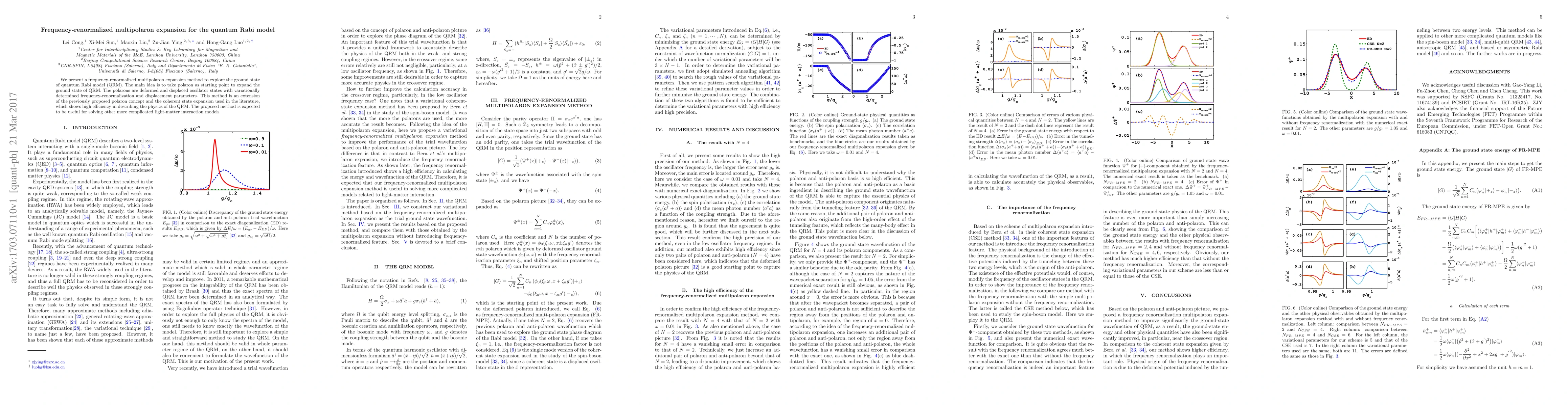 This paper introduces a frequency-renormalized multipolaron expansion method to study the ground state of the quantum Rabi model, utilizing deformed and displaced oscillator states with variational frequency-renormalization and displacement parameters, extending the polaron concept for efficient description of light-matter interactions.