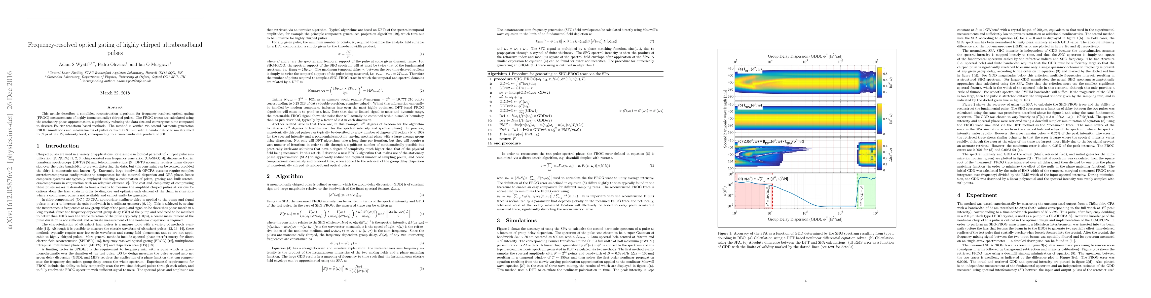 This paper presents a simplified reconstruction algorithm for frequency-resolved optical gating (FROG) of highly chirped ultrabroadband pulses, utilizing the stationary phase approximation to reduce data size and convergence time. The method is validated through simulations and measurements of 800nm pulses with a 55nm bandwidth stretched to 32ps.