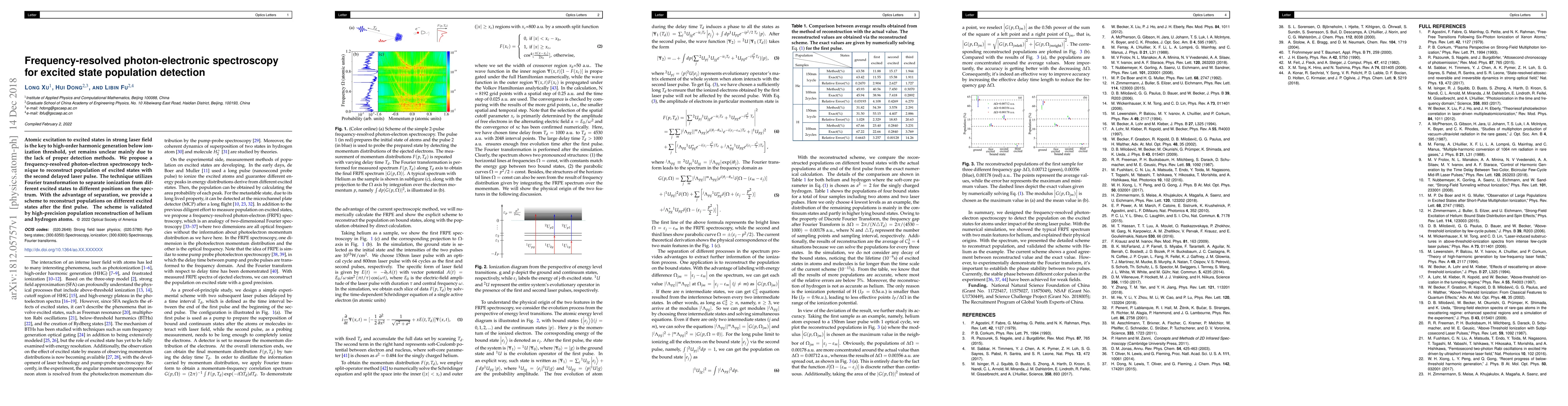 Atomic excitation to excited states in strong laser field is the key to high-order harmonic generation below ionization threshold, yet remains unclear mainly due to the lack of proper detection methods. We propose a frequency-resolved photon-electron spectroscopy technique to reconstruct population of excited states with the second delayed laser pulse. The technique utilizes Fourier transformation to separate ionization from different excited states to different positions on the spectrum. With the advantage of separation, we provide a scheme to reconstruct populations on different excited states after the first pulse. The scheme is validated by high-precision population reconstruction of helium and hydrogen atoms.