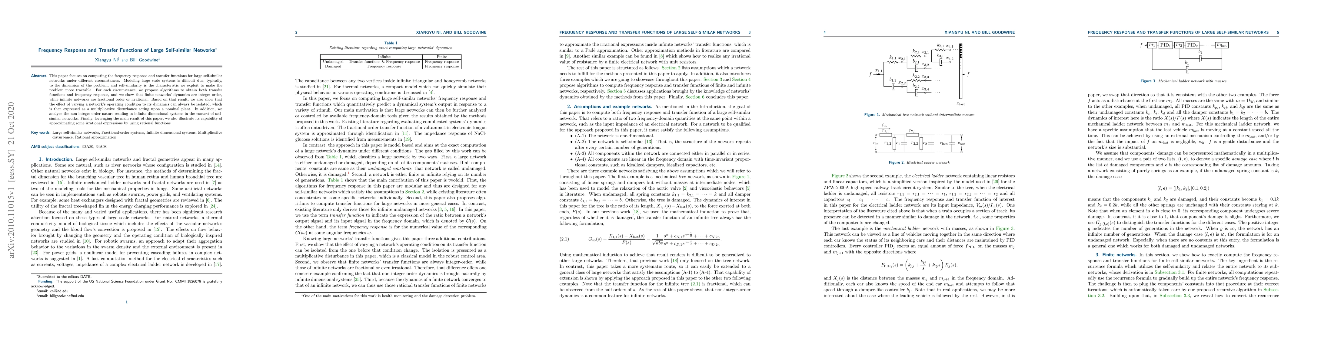 This paper focuses on computing the frequency response and transfer functions for large self-similar networks under different circumstances. Modeling large scale systems is difficult due, typically, to the dimension of the problem, and self-similarity is the characteristic we exploit to make the problem more tractable. For each circumstance, we propose algorithms to obtain both transfer functions and frequency response, and we show that finite networks' dynamics are integer order, while infinite networks are fractional order or irrational. Based on that result, we also show that the effect of varying a network's operating condition to its dynamics can always be isolated, which is then expressed as a multiplicative disturbance acting upon a nominal plant. In addition, we analyze the non-integer-order nature residing in infinite dimensional systems in the context of self-similar networks. Finally, leveraging the main result of this paper, we also illustrate its capability of approximating some irrational expressions by using rational functions.