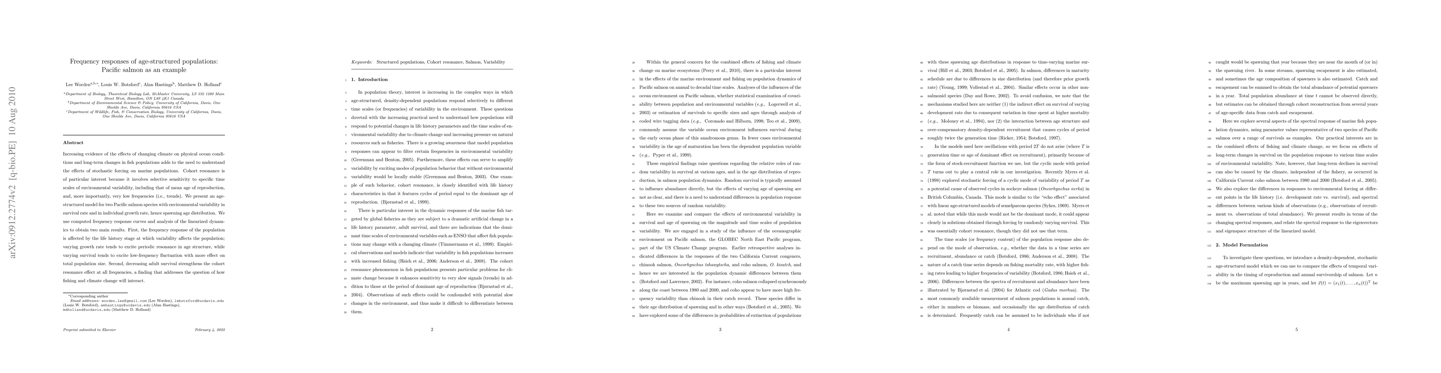 Increasing evidence of the effects of changing climate on physical ocean conditions and long-term changes in fish populations adds to the need to understand the effects of stochastic forcing on marine populations. Cohort resonance is of particular interest because it involves selective sensitivity to specific time scales of environmental variability, including that of mean age of reproduction, and, more importantly, very low frequencies (i.e., trends). We present an age-structured model for two Pacific salmon species with environmental variability in survival rate and in individual growth rate, hence spawning age distribution. We use computed frequency response curves and analysis of the linearized dynamics to obtain two main results. First, the frequency response of the population is affected by the life history stage at which variability affects the population; varying growth rate tends to excite periodic resonance in age structure, while varying survival tends to excite low-frequency fluctuation with more effect on total population size. Second, decreasing adult survival strengthens the cohort resonance effect at all frequencies, a finding that addresses the question of how fishing and climate change will interact.