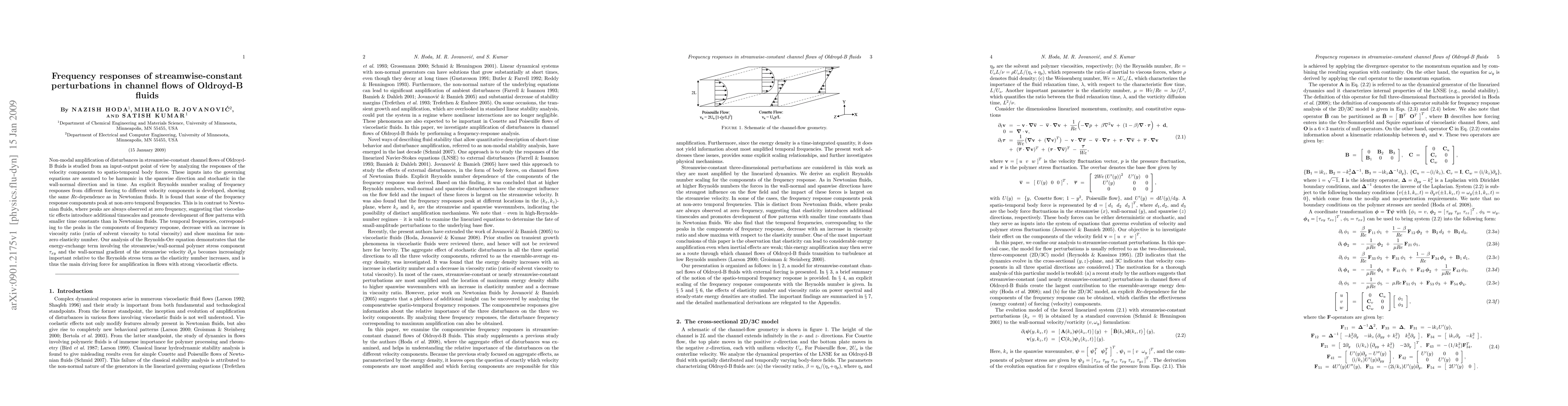 Non-modal amplification of disturbances in streamwise-constant channel flows of Oldroyd-B fluids is studied from an input-output point of view by analyzing the responses of the velocity components to spatio-temporal body forces. These inputs into the governing equations are assumed to be harmonic in the spanwise direction and stochastic in the wall-normal direction and in time. An explicit Reynolds number scaling of frequency responses from different forcing to different velocity components is developed, showing the same $Re$-dependence as in Newtonian fluids. It is found that some of the frequency response components peak at non-zero temporal frequencies. This is in contrast to Newtonian fluids, where peaks are always observed at zero frequency, suggesting that viscoelastic effects introduce additional timescales and promote development of flow patterns with smaller time constants than in Newtonian fluids. The temporal frequencies, corresponding to the peaks in the components of frequency response, decrease with an increase in viscosity ratio (ratio of solvent viscosity to total viscosity) and show maxima for non-zero elasticity number. Our analysis of the Reynolds-Orr equation demonstrates that the energy-exchange term involving the streamwise/wall-normal polymer stress component $\tau_{xy}$ and the wall-normal gradient of the streamwise velocity $\partial_y u$ becomes increasingly important relative to the Reynolds stress term as the elasticity number increases, and is thus the main driving force for amplification in flows with strong viscoelastic effects.