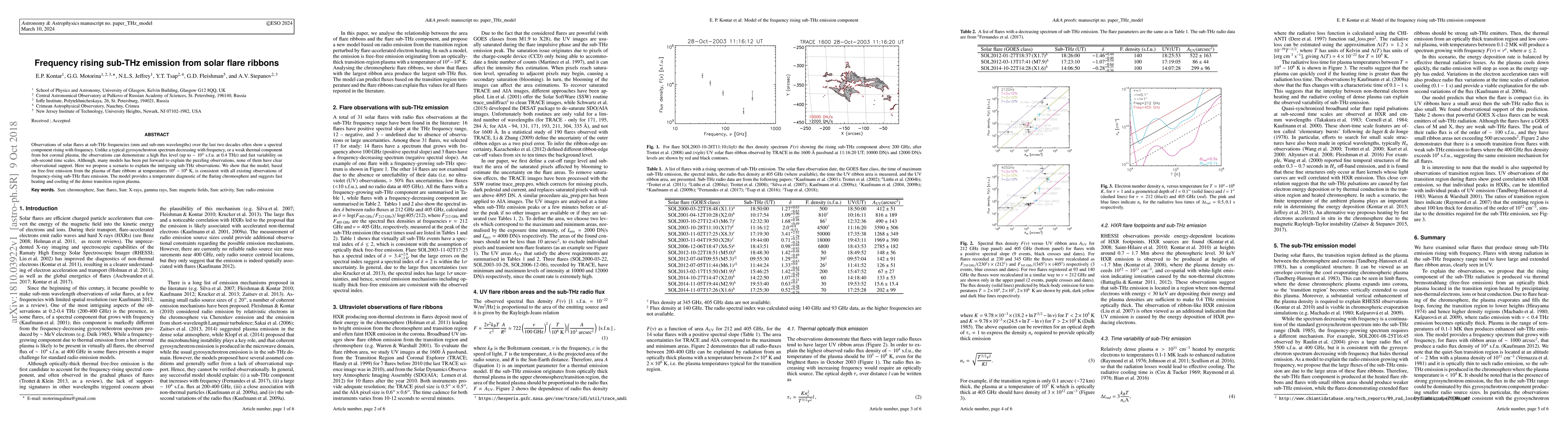 Observations of solar flares at sub-THz frequencies (mm and sub-mm wavelengths) over the last two decades often show a spectral component rising with frequency. Unlike a typical gyrosynchrotron spectrum decreasing with frequency, or a weak thermal component from hot coronal plasma, the observations can demonstrate a high flux level (up to ~10^4 s.f.u. at 0.4 THz) and fast variability on sub-second time scales. Although, many models has been put forward to explain the puzzling observations, none of them have clear observational support. Here we propose a scenario to explain the intriguing sub-THz observations. We show that the model, based on free-free emission from the plasma of flare ribbons at temperatures 10^4-10^6 K, is consistent with all existing observations of frequency-rising sub-THz flare emission. The model provides a temperature diagnostic of the flaring chromosphere and suggests fast heating and cooling of the dense transition region plasma.