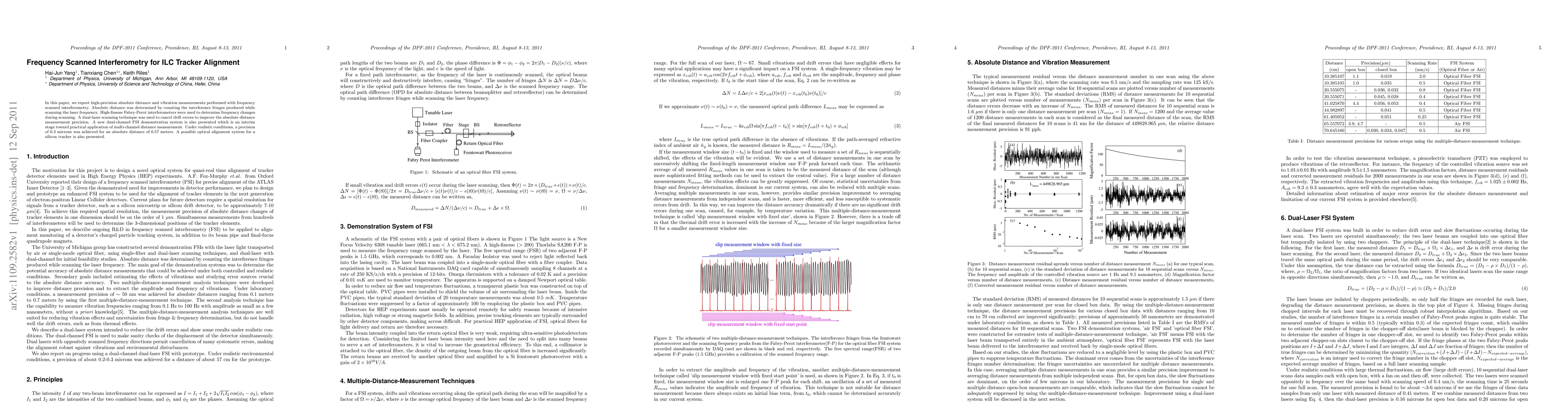 In this paper, we report high-precision absolute distance and vibration measurements performed with frequency scanned interferometry. Absolute distance was determined by counting the interference fringes produced while scanning the laser frequency. High-finesse Fabry-Perot interferometers were used to determine frequency changes during scanning. A dual-laser scanning technique was used to cancel drift errors to improve the absolute distance measurement precision. A new dual-channel FSI demonstration system is also presented which is an interim stage toward practical application of multi-channel distance measurement. Under realistic conditions, a precision of 0.3 microns was achieved for an absolute distance of 0.57 meters. A possible optical alignment system for a silicon tracker is also presented.