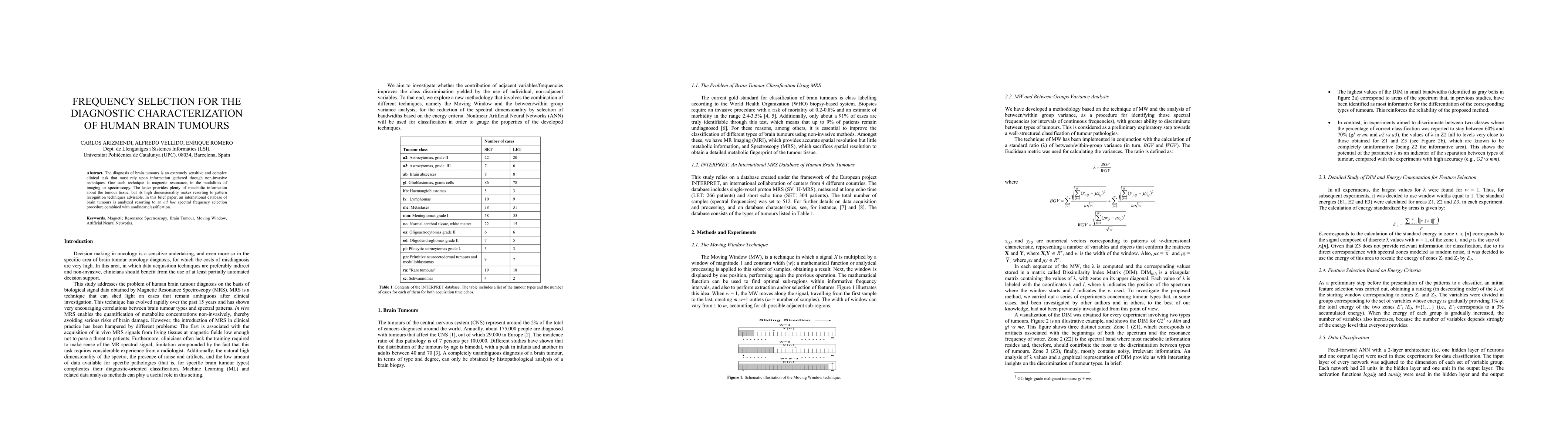 The paper introduces a novel spectral frequency selection procedure based on the Moving Window technique and between-groups variance analysis, combined with feed-forward ANNs for brain tumor classification using MRS data.