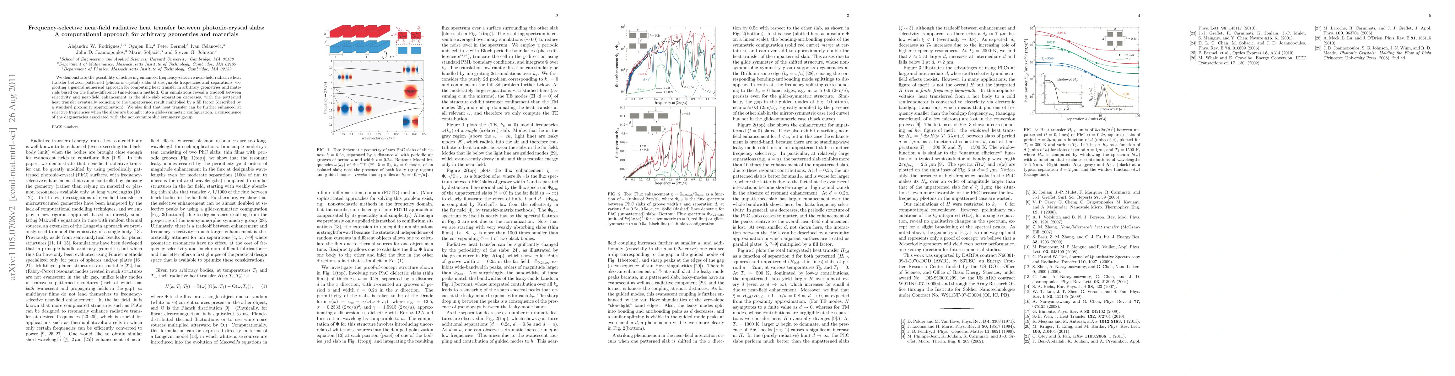 This paper explores the enhancement of frequency-selective near-field radiative heat transfer using photonic-crystal slabs, employing a general computational method based on the finite-difference time-domain method. The study reveals a tradeoff between frequency selectivity and near-field enhancement as slab separation decreases, with enhanced heat transfer achievable at specific frequencies through a glide-symmetric configuration.