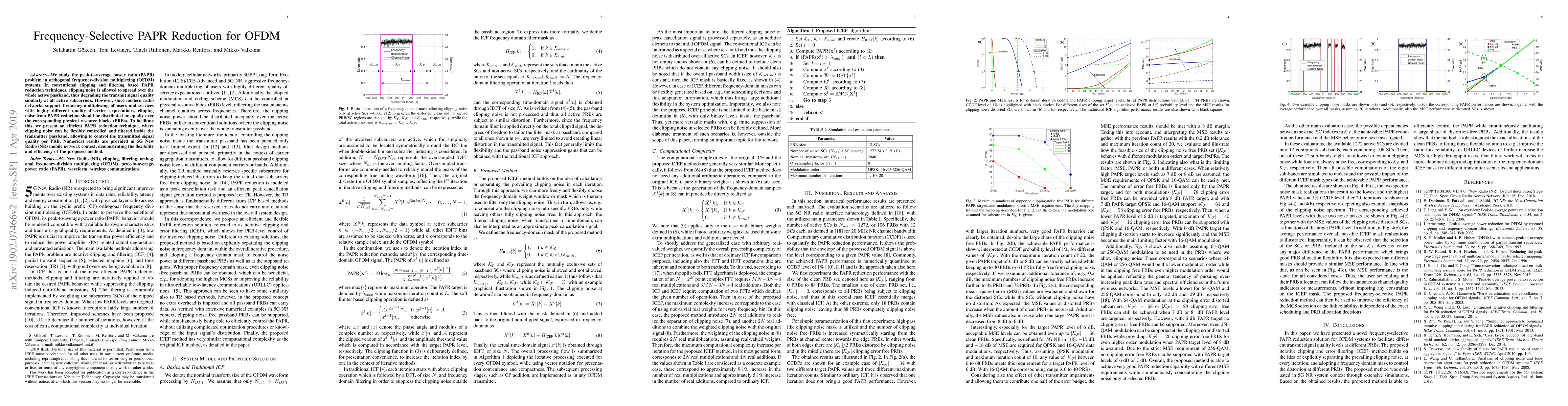 The paper presents an iterative clipping and error filtering (ICEF) method for PAPR reduction in OFDM systems, separating clipping noise and applying a frequency-domain mask to control distortion at different PRBs.