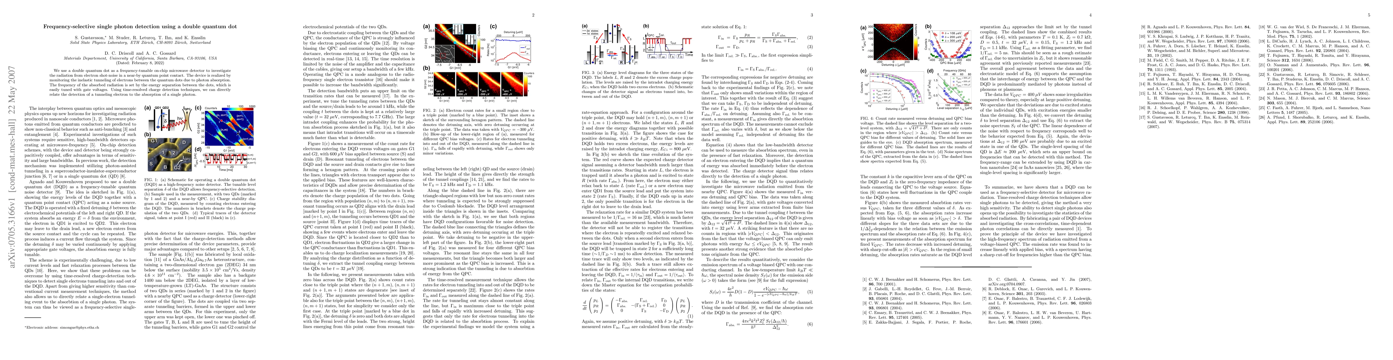 This paper describes a double quantum dot system used as a frequency-selective single photon detector, where the absorbed radiation frequency is controlled by the energy separation between the dots, tunable via gate voltages. The detection of single photons is achieved by monitoring inelastic tunneling events linked to photon absorption.