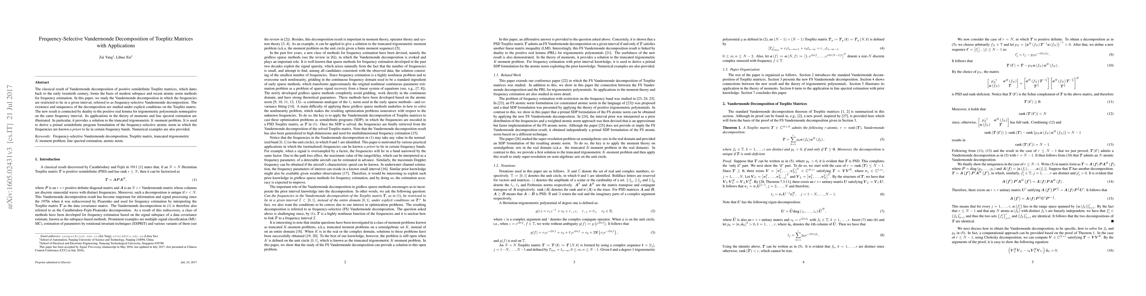 This paper explores the frequency-selective Vandermonde decomposition of positive semidefinite Toeplitz matrices, establishing its existence and uniqueness under specific conditions. It connects this decomposition to the positive real lemma for trigonometric polynomials and applies it to the theory of moments and spectral estimation, solving the truncated trigonometric $K$-moment problem.