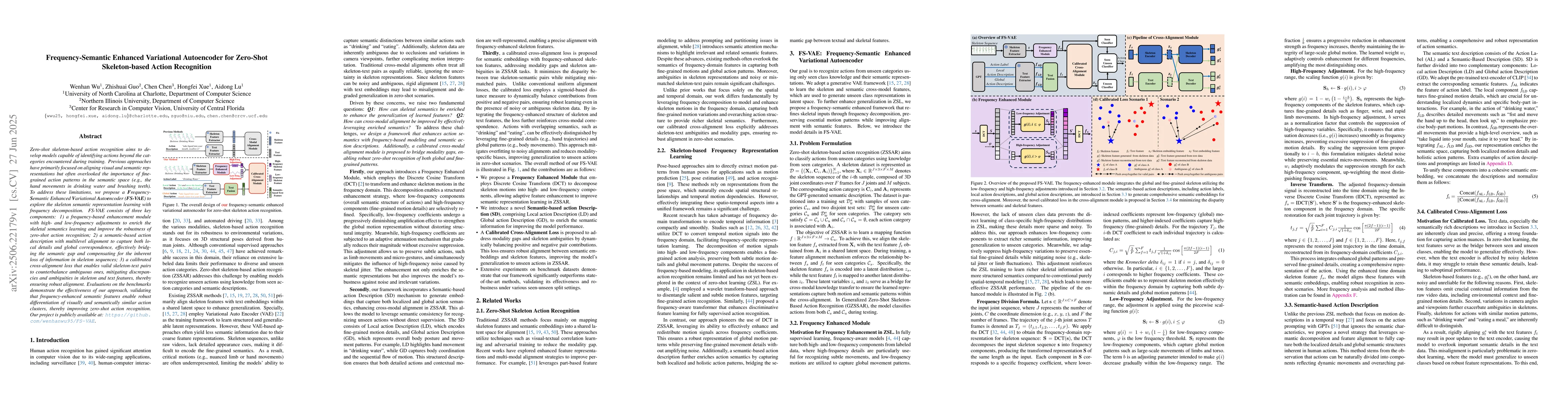 Zero-shot skeleton-based action recognition aims to develop models capable of identifying actions beyond the categories encountered during training. Previous approaches have primarily focused on aligning visual and semantic representations but often overlooked the importance of fine-grained action patterns in the semantic space (e.g., the hand movements in drinking water and brushing teeth). To address these limitations, we propose a Frequency-Semantic Enhanced Variational Autoencoder (FS-VAE) to explore the skeleton semantic representation learning with frequency decomposition. FS-VAE consists of three key components: 1) a frequency-based enhancement module with high- and low-frequency adjustments to enrich the skeletal semantics learning and improve the robustness of zero-shot action recognition; 2) a semantic-based action description with multilevel alignment to capture both local details and global correspondence, effectively bridging the semantic gap and compensating for the inherent loss of information in skeleton sequences; 3) a calibrated cross-alignment loss that enables valid skeleton-text pairs to counterbalance ambiguous ones, mitigating discrepancies and ambiguities in skeleton and text features, thereby ensuring robust alignment. Evaluations on the benchmarks demonstrate the effectiveness of our approach, validating that frequency-enhanced semantic features enable robust differentiation of visually and semantically similar action clusters, improving zero-shot action recognition.