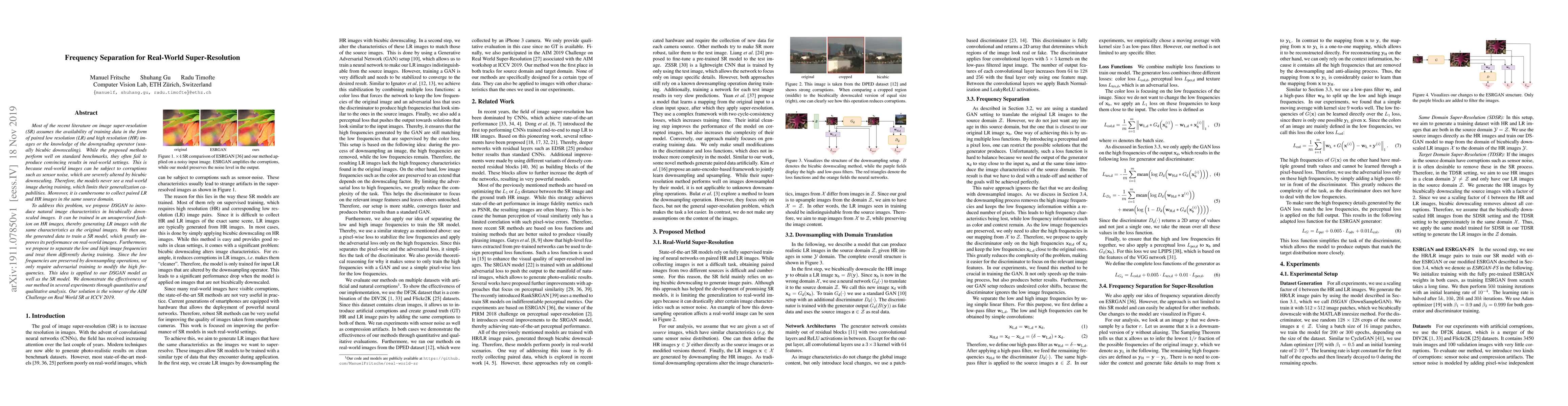 Most of the recent literature on image super-resolution (SR) assumes the availability of training data in the form of paired low resolution (LR) and high resolution (HR) images or the knowledge of the downgrading operator (usually bicubic downscaling). While the proposed methods perform well on standard benchmarks, they often fail to produce convincing results in real-world settings. This is because real-world images can be subject to corruptions such as sensor noise, which are severely altered by bicubic downscaling. Therefore, the models never see a real-world image during training, which limits their generalization capabilities. Moreover, it is cumbersome to collect paired LR and HR images in the same source domain. To address this problem, we propose DSGAN to introduce natural image characteristics in bicubically downscaled images. It can be trained in an unsupervised fashion on HR images, thereby generating LR images with the same characteristics as the original images. We then use the generated data to train a SR model, which greatly improves its performance on real-world images. Furthermore, we propose to separate the low and high image frequencies and treat them differently during training. Since the low frequencies are preserved by downsampling operations, we only require adversarial training to modify the high frequencies. This idea is applied to our DSGAN model as well as the SR model. We demonstrate the effectiveness of our method in several experiments through quantitative and qualitative analysis. Our solution is the winner of the AIM Challenge on Real World SR at ICCV 2019.