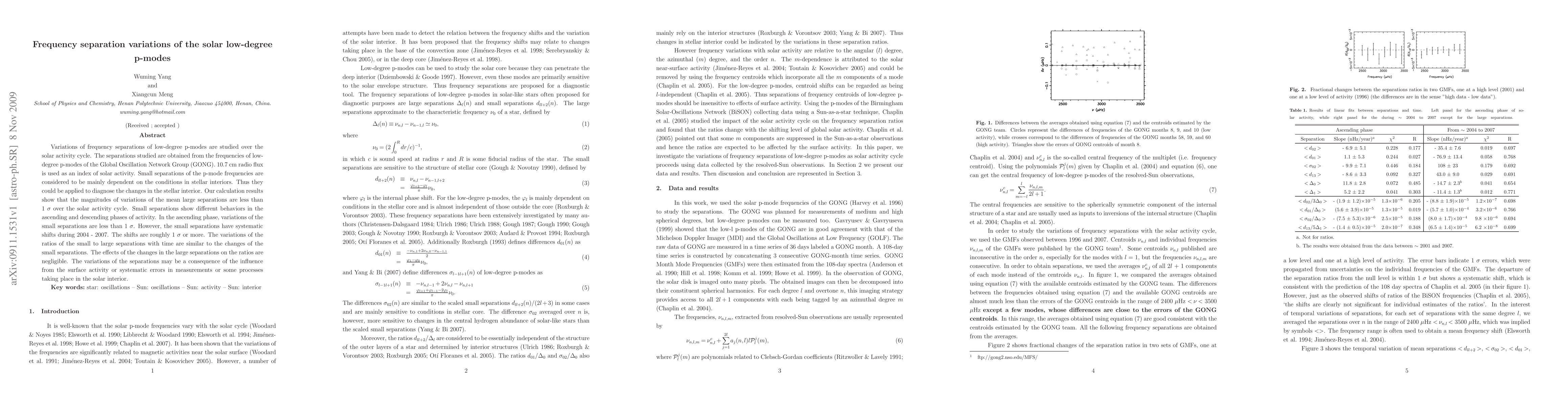 This study investigates the variations in frequency separations of low-degree solar p-modes over the solar activity cycle, finding that mean large separations show minimal variation, while small separations exhibit significant shifts during the 2004-2007 period, suggesting influences from surface activity or measurement errors.