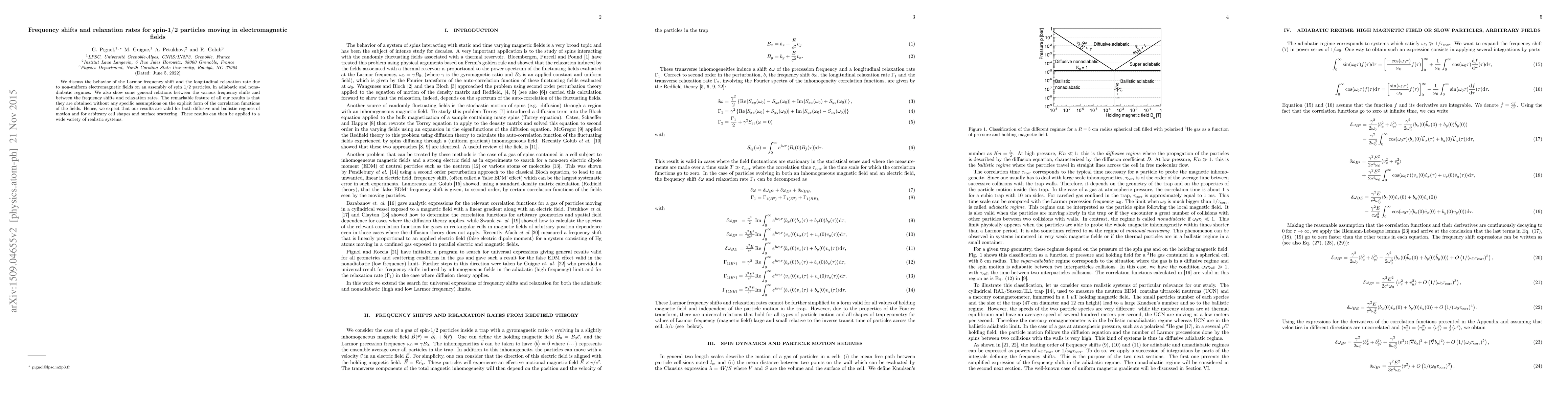 We discuss the behaviour of the Larmor frequency shift and the longitudinal relaxation rate due to non-uniform electromagnetic fields on an assembly of spin 1/2 particles, in adiabatic and nonadiabatic regimes. We also show some general relations between the various frequency shifts and between the frequency shifts and relaxation rates. The remarkable feature of all our results is that they were obtained without any specific assumptions on the explicit form of the correlation functions of the fields. Hence, we expect that our results are valid both for diffusive and ballistic regime of motion and arbitrary cell shapes and surface scattering. These results can then be applied to a wide variety of realistic systems.