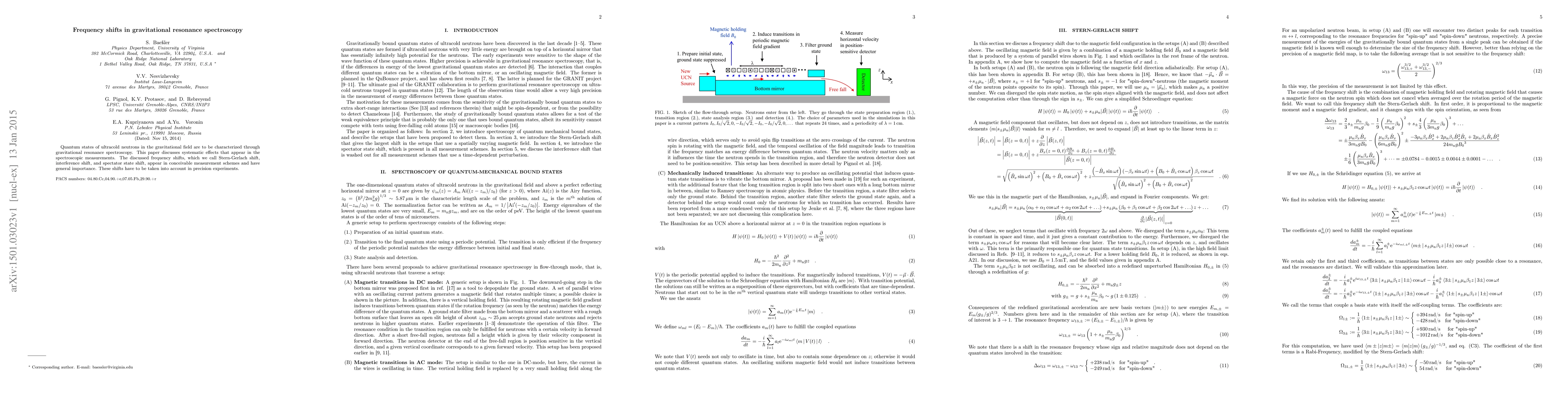 Quantum states of ultracold neutrons in the gravitational field are to be characterized through gravitational resonance spectroscopy. This paper discusses systematic effects that appear in the spectroscopic measurements. The discussed frequency shifts, which we call Stern-Gerlach shift, interference shift, and spectator state shift, appear in conceivable measurement schemes and have general importance. These shifts have to be taken into account in precision experiments.