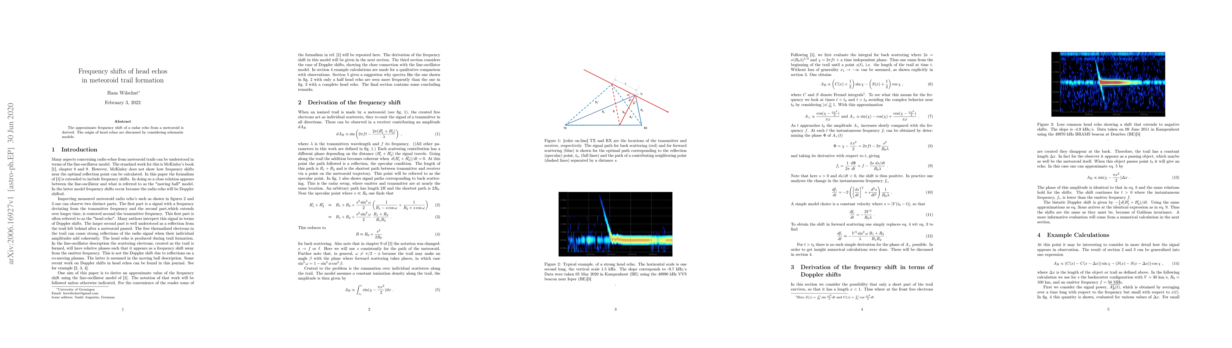 The approximate frequency shift of a radar echo from a meteoroid is derived. The origin of head echos observed during trail formation are discussed by considering schematic models. The echo is either a reflection of the radar signal from thermalized electrons in the meteoroid trail or from the plasma electrons co-moving with the meteoroid itself. It is shown that in these opposite models the frequency shifts of the echo relative to the radar emitter frequency must be identical, even though the underlying physics differs. Calculations were made that give the echo frequency as function of time, allowing qualitative comparison with observations. Some typical observations show a conspicuous absence of negative frequency shifts in the head echo in forward scattering. Arguments are given that this can correspond to meteoroids with the co-moving plasma in front.