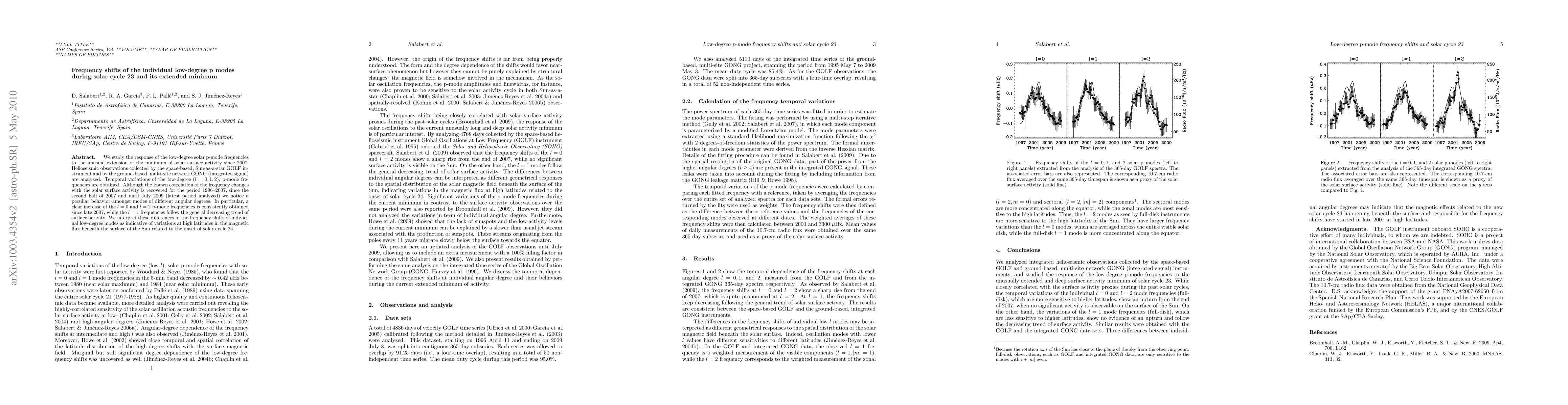 This study analyzes the frequency shifts of low-degree solar p-modes during the extended solar minimum since 2007, revealing a distinct increase in l=0 and l=2 modes while l=1 modes follow the general trend of decreasing activity, suggesting high-latitude magnetic flux variations linked to the onset of solar cycle 24.