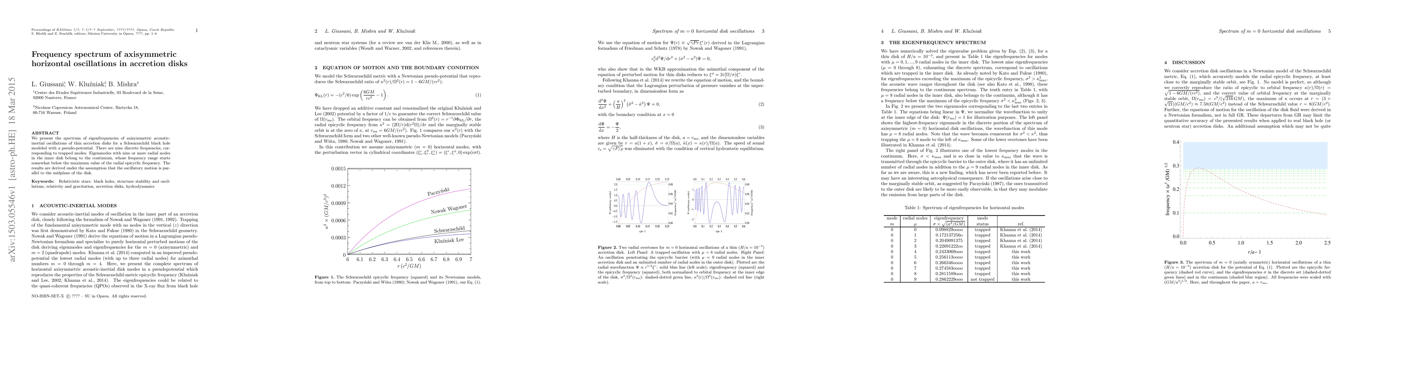 We present the spectrum of eigenfrequencies of axisymmetric acoustic-inertial oscillations of thin accretion disks for a Schwarzschild black hole modeled with a pseudo-potential. There are nine discrete frequencies, corresponding to trapped modes. Eigenmodes with nine or more radial nodes in the inner disk belong to the continuum, whose frequency range starts somewhat below the maximum value of the radial epicyclic frequency. The results are derived under the assumption that the oscillatory motion is parallel to the midplane of the disk.