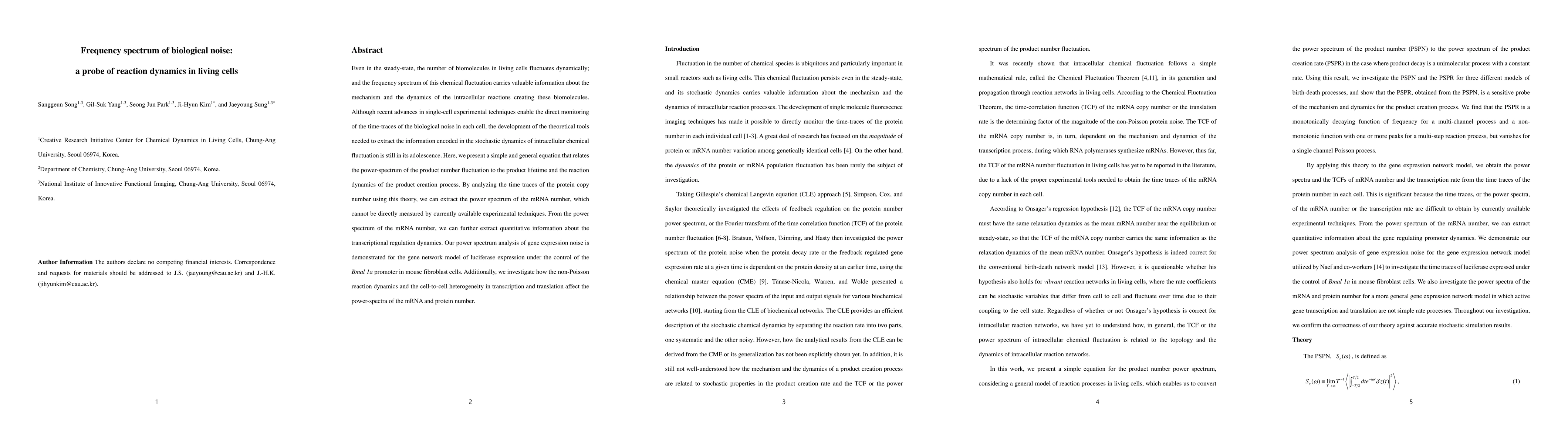 This paper develops a theoretical framework to analyze the frequency spectrum of biological noise in living cells, linking it to intracellular reaction dynamics. The authors present an equation that relates the power-spectrum of biomolecule number fluctuations to reaction dynamics and demonstrate its application in extracting mRNA number power spectra and transcriptional regulation dynamics from protein copy number time traces in luciferase gene expression.