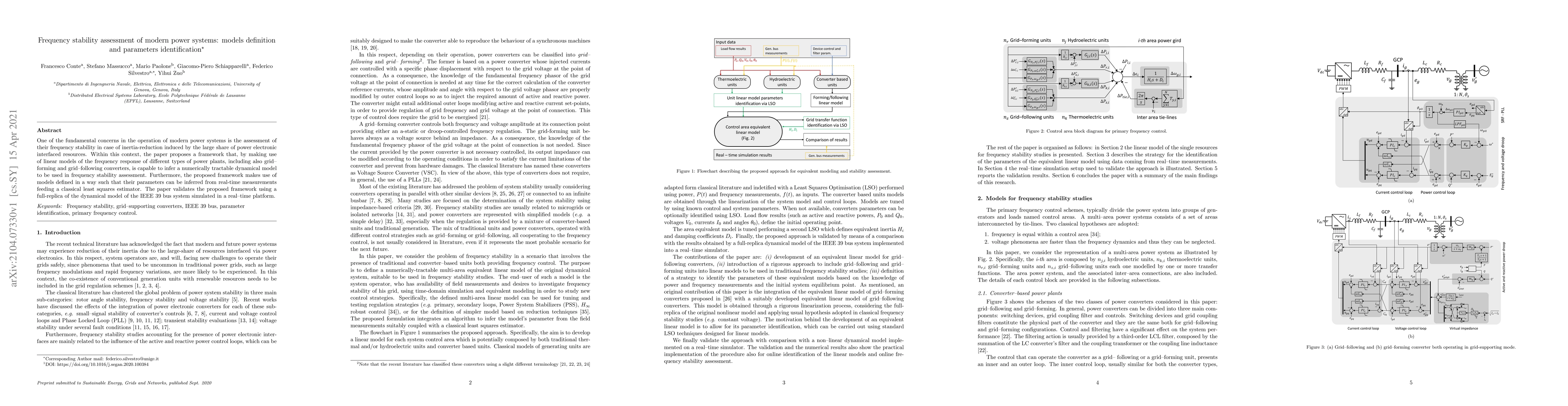 This paper proposes a framework for assessing frequency stability in modern power systems, focusing on inertia-reduction due to power electronic interfaces. It utilizes linear models of power plants and grid converters to develop a dynamical model for stability assessment, with parameters inferred from real-time measurements using a least squares estimator. The framework is validated through simulations of the IEEE 39 bus system on a real-time platform.