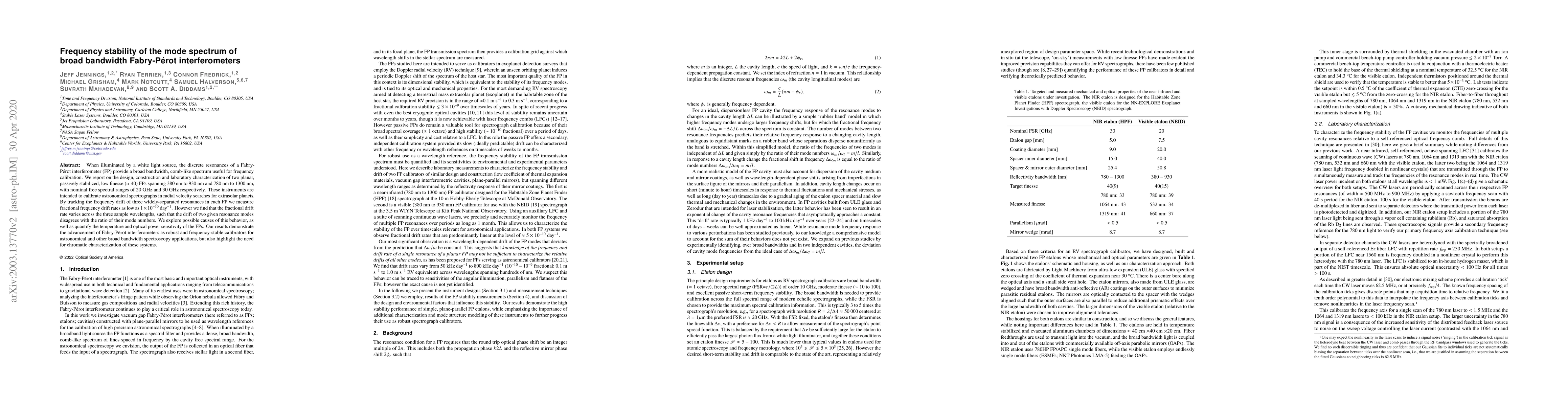 Researchers developed stable Fabry-Perot interferometers to calibrate astronomical spectrographs, achieving frequency stability of 1 x 10^(-10) / day, but found that drift rates vary across wavelengths.
