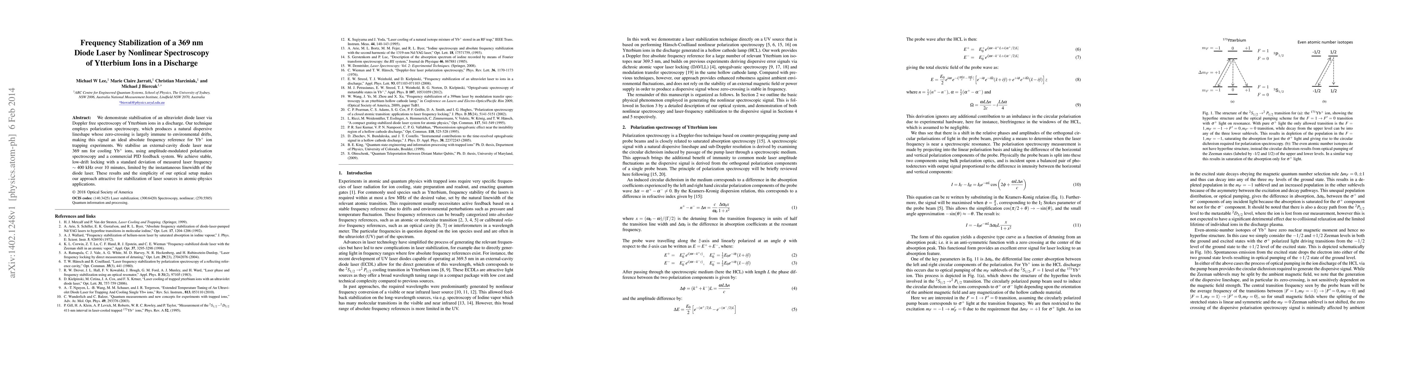 This paper presents a method for stabilizing a 369 nm diode laser by utilizing Doppler-free spectroscopy of ytterbium ions in a discharge. The technique, employing polarization spectroscopy, provides a stable frequency reference immune to environmental drifts, achieving a low-drift locking with a standard deviation of ~400 kHz over 10 minutes.