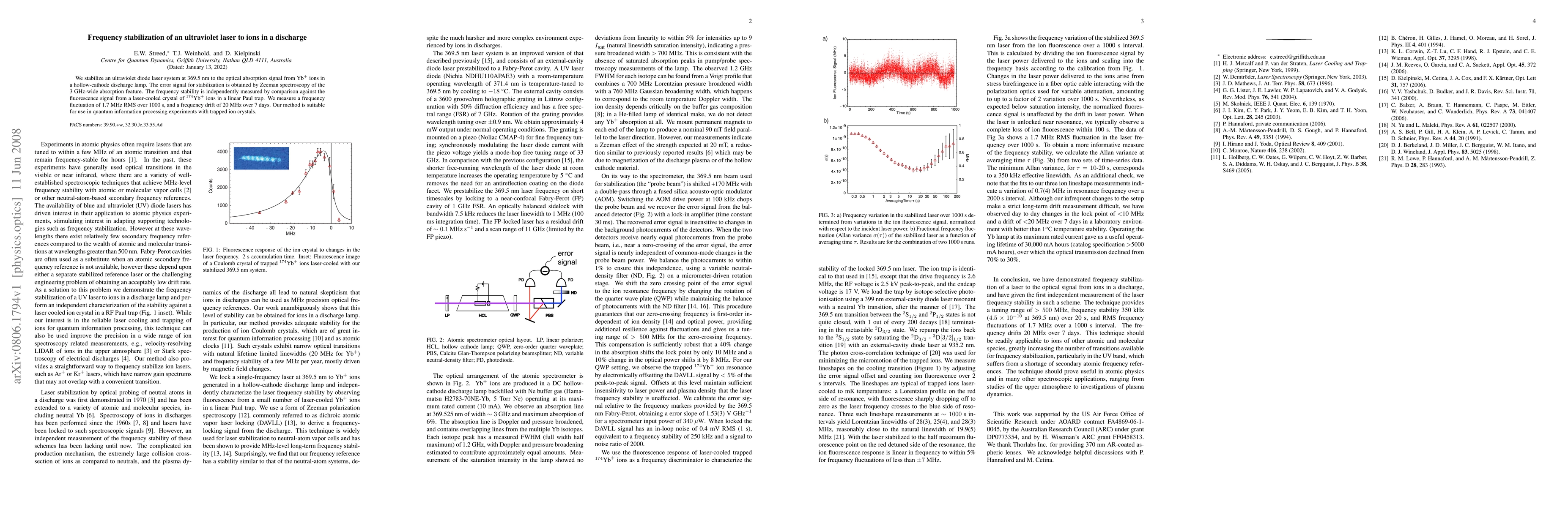 This study stabilizes an ultraviolet laser at 369.5 nm to Yb+ ions in a hollow-cathode lamp using Zeeman spectroscopy, achieving a frequency fluctuation of 1.7 MHz RMS over 1000 seconds and a drift of 20 MHz over 7 days, suitable for quantum information experiments.