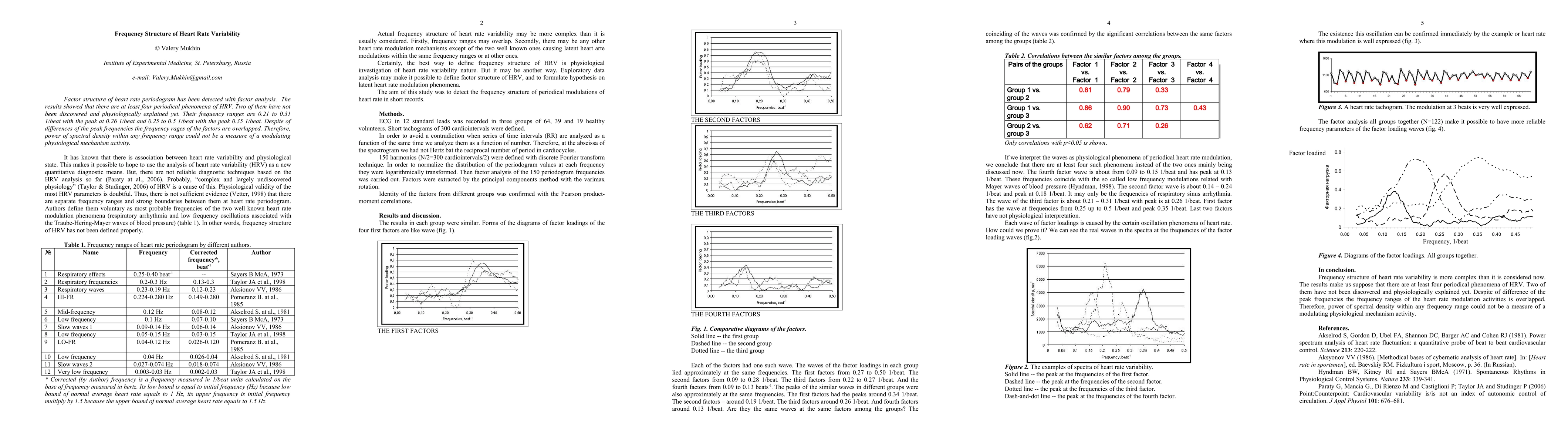 Factor structure of heart rate periodogram has been detected with factor analysis. The results showed that there are at least four periodical phenomena of HRV. Two of them have not been discovered and physiologically explained yet. Their frequency ranges are 0.21 to 0.31 1/beat with the peak at 0.26 1/beat and 0.25 to 0.5 1/beat with the peak 0.35 1/beat. Despite of differences of the peak frequencies the frequency rages of the factors are overlapped. Therefore, power of spectral density within any frequency range could not be a measure of a modulating physiological mechanism activity.