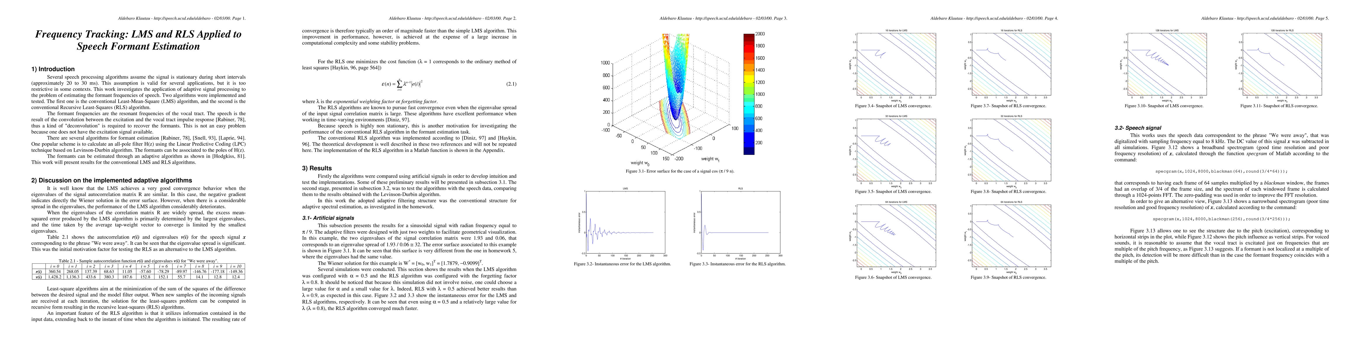 Introduction Several speech processing algorithms assume the signal is stationary during short intervals (approximately 20 to 30 ms). This assumption is valid for several applications, but it is too restrictive in some contexts. This work investigates the application of adaptive signal processing to the problem of estimating the formant frequencies of speech. Two algorithms were implemented and tested. The first one is the conventional Least-Mean-Square (LMS) algorithm, and the second is the conventional Recursive Least-Squares (RLS) algorithm. The formant frequencies are the resonant frequencies of the vocal tract. The speech is the result of the convolution between the excitation and the vocal tract impulse response [Rabiner, 78], thus a kind of "deconvolution" is required to recover the formants. This is not an easy problem because one does not have the excitation signal available. There are several algorithms for formant estimation [Rabiner, 78], [Snell, 93], [Laprie, 94