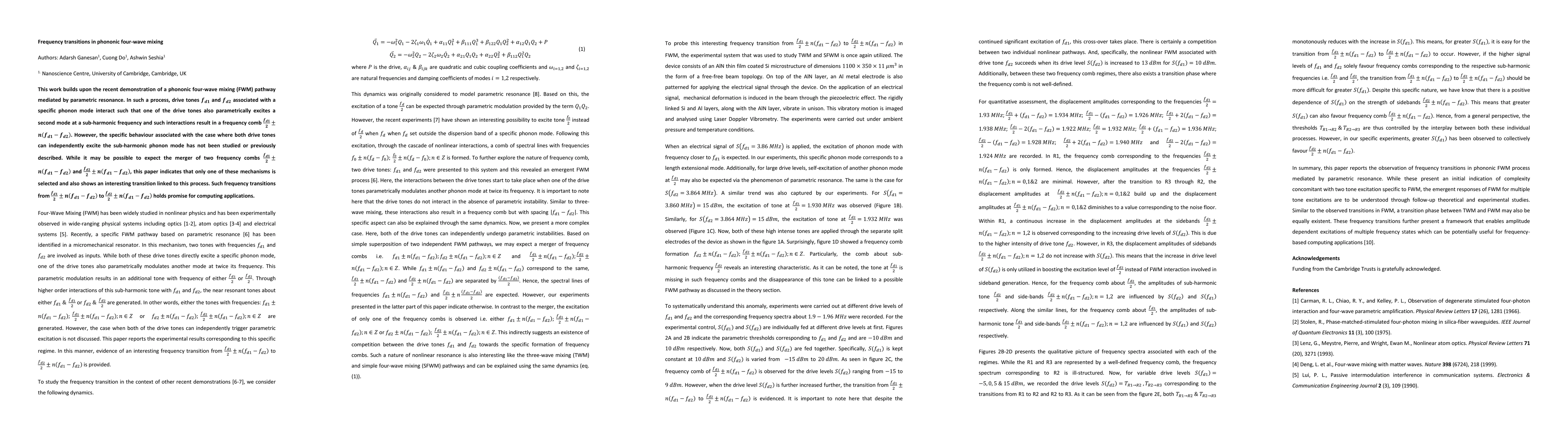 This paper investigates phononic four-wave mixing where drive tones independently excite sub-harmonic phonon modes, revealing a selective frequency transition mechanism that could enhance computing applications. The selected transition from one frequency comb to another indicates potential technological advancements.