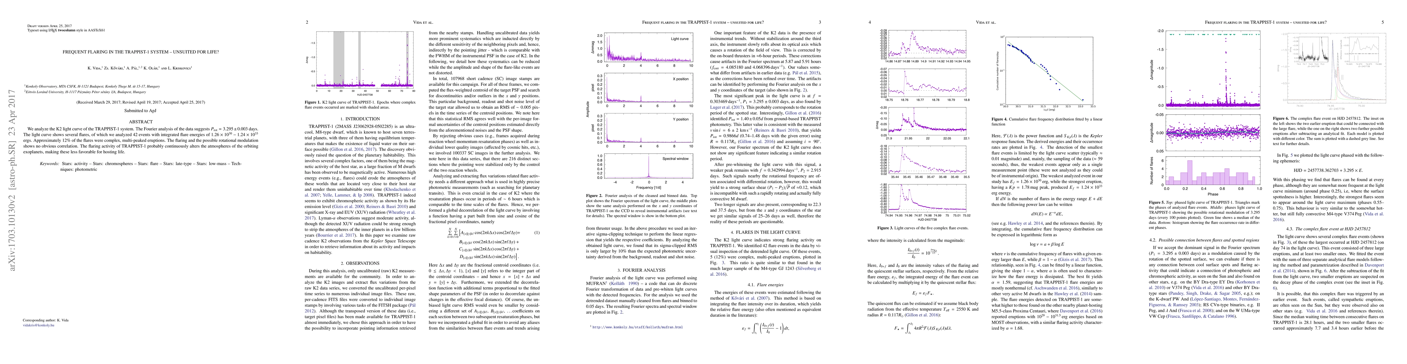 We analyze short cadence K2 light curve of the TRAPPIST-1 system. Fourier analysis of the data suggests $P_\mathrm{rot}=3.295\pm0.003$ days. The light curve shows several flares, of which we analyzed 42 events, these have integrated flare energies of $1.26\times10^{30}-1.24\times10^{33}$ ergs. Approximately 12% of the flares were complex, multi-peaked eruptions. The flaring and the possible rotational modulation shows no obvious correlation. The flaring activity of TRAPPIST-1 probably continuously alters the atmospheres of the orbiting exoplanets, making these less favorable for hosting life.