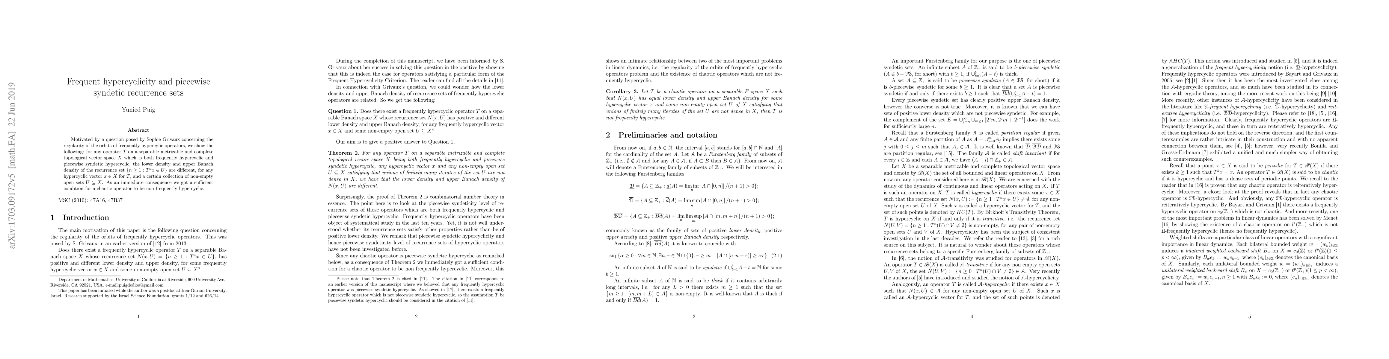 Motivated by a question posed by Sophie Grivaux concerning the regularity of the orbits of frequently hypercylic operators, we show the following: for any operator $T$ on a separable metrizable and complete topological vector space $X$ which is both frequently hypercyclic and piecewise syndetic hypercyclic, the lower density and upper Banach density of the recurrence set $\{n\geq 1: T^n x\in U\}$ are different, for any hypercyclic vector $x\in X$ for $T$, and a certain collection of non-empty open sets $U\subseteq X$. As an immediate consequence we got a sufficient condition for a chaotic operator to be non frequently hypercyclic.