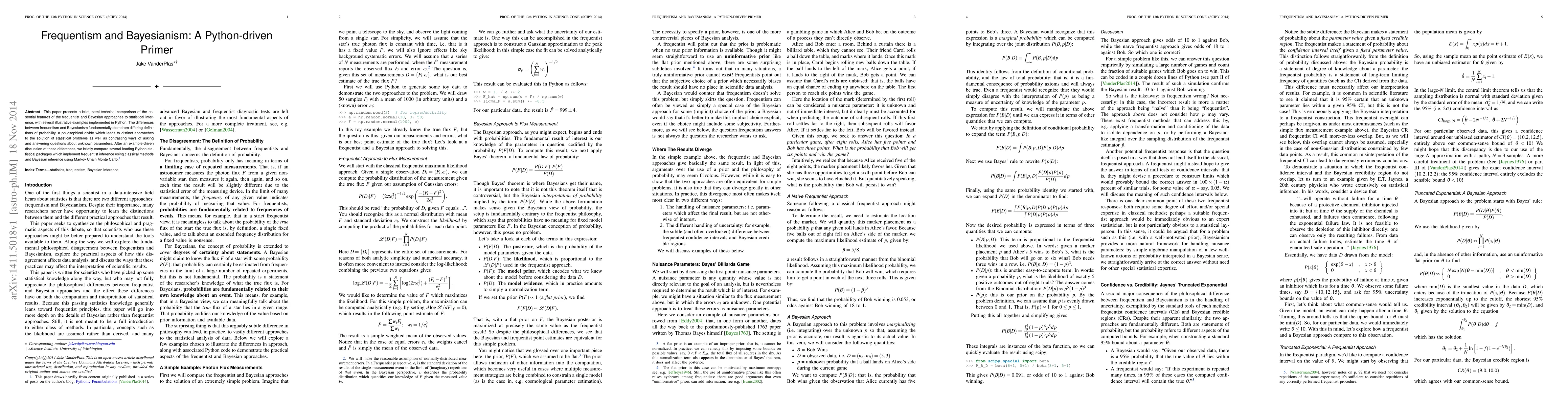 This paper presents a brief, semi-technical comparison of the essential features of the frequentist and Bayesian approaches to statistical inference, with several illustrative examples implemented in Python. The differences between frequentism and Bayesianism fundamentally stem from differing definitions of probability, a philosophical divide which leads to distinct approaches to the solution of statistical problems as well as contrasting ways of asking and answering questions about unknown parameters. After an example-driven discussion of these differences, we briefly compare several leading Python statistical packages which implement frequentist inference using classical methods and Bayesian inference using Markov Chain Monte Carlo.