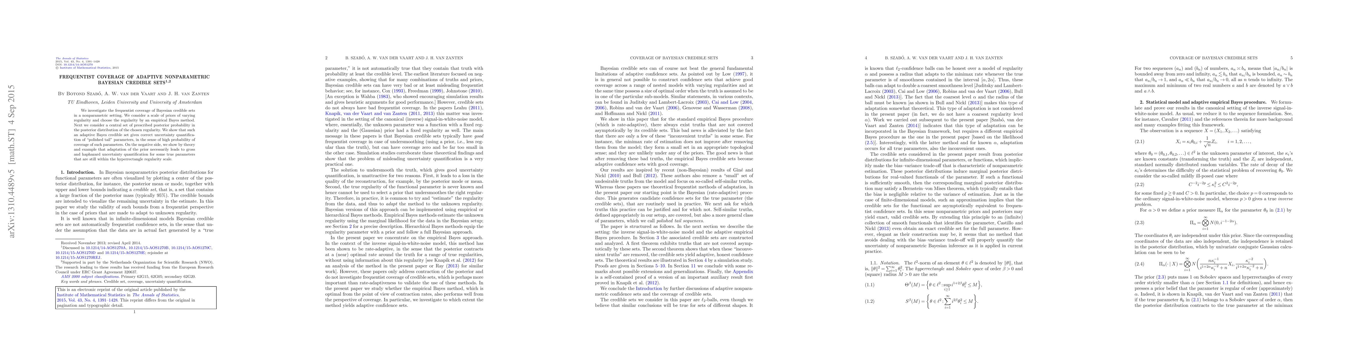 This paper examines the frequentist coverage of adaptive nonparametric Bayesian credible sets, demonstrating that adaptive methods provide accurate uncertainty quantification for "polished tail" parameters but can lead to unreliable quantification for other parameters within the chosen regularity scale.