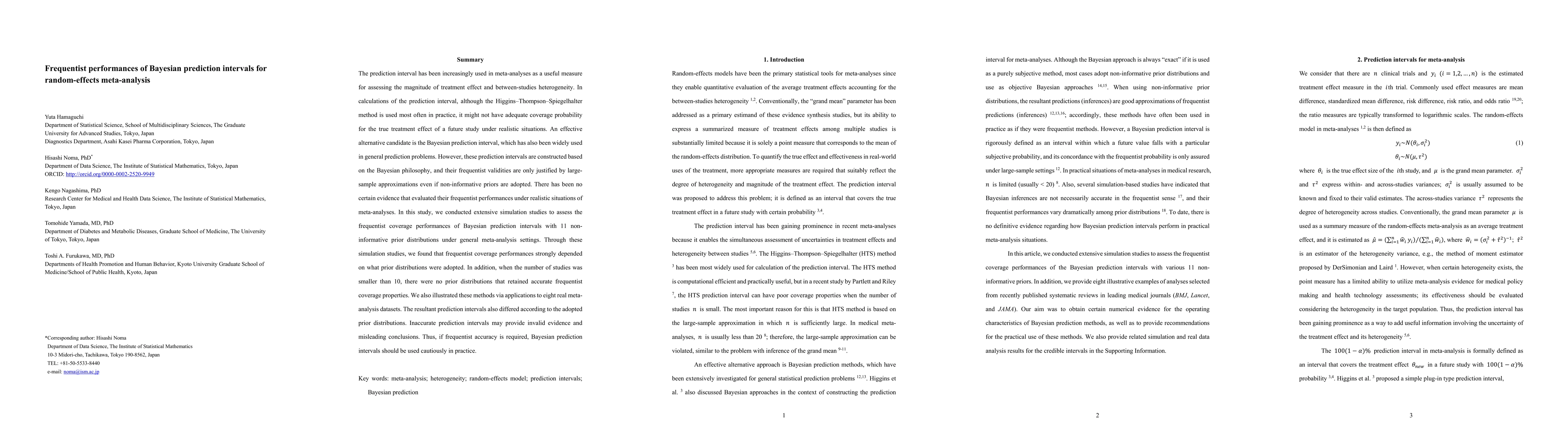 The prediction interval has been increasingly used in meta-analyses as a useful measure for assessing the magnitude of treatment effect and between-studies heterogeneity. In calculations of the prediction interval, although the Higgins-Thompson-Spiegelhalter method is used most often in practice, it might not have adequate coverage probability for the true treatment effect of a future study under realistic situations. An effective alternative candidate is the Bayesian prediction interval, which has also been widely used in general prediction problems. However, these prediction intervals are constructed based on the Bayesian philosophy, and their frequentist validities are only justified by large-sample approximations even if non-informative priors are adopted. There has been no certain evidence that evaluated their frequentist performances under realistic situations of meta-analyses. In this study, we conducted extensive simulation studies to assess the frequentist coverage performances of Bayesian prediction intervals with 11 non-informative prior distributions under general meta-analysis settings. Through these simulation studies, we found that frequentist coverage performances strongly depended on what prior distributions were adopted. In addition, when the number of studies was smaller than 10, there were no prior distributions that retained accurate frequentist coverage properties. We also illustrated these methods via applications to eight real meta-analysis datasets. The resultant prediction intervals also differed according to the adopted prior distributions. Inaccurate prediction intervals may provide invalid evidence and misleading conclusions. Thus, if frequentist accuracy is required, Bayesian prediction intervals should be used cautiously in practice.