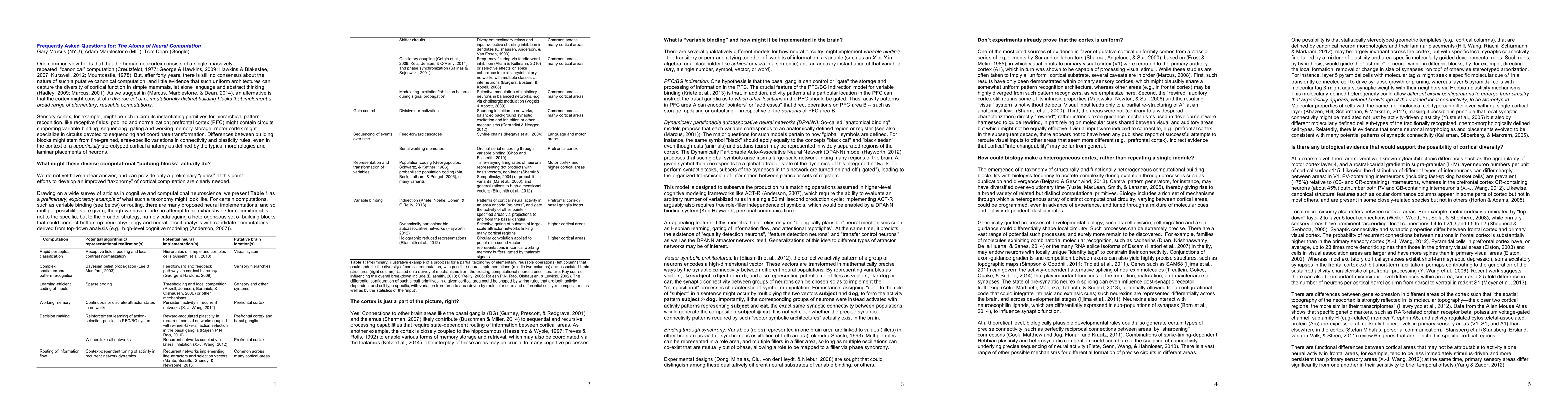 Based on a survey of the literature, we attempt to answer Frequently Asked Questions on issues of cortical uniformity vs. non-uniformity, the neural mechanisms of symbolic variable binding, and other issues highlighted in (Marcus, Marblestone and Dean. "The Atoms of Neural Computation". Science. 31 October 2014. Vol 346. Issue 6209).