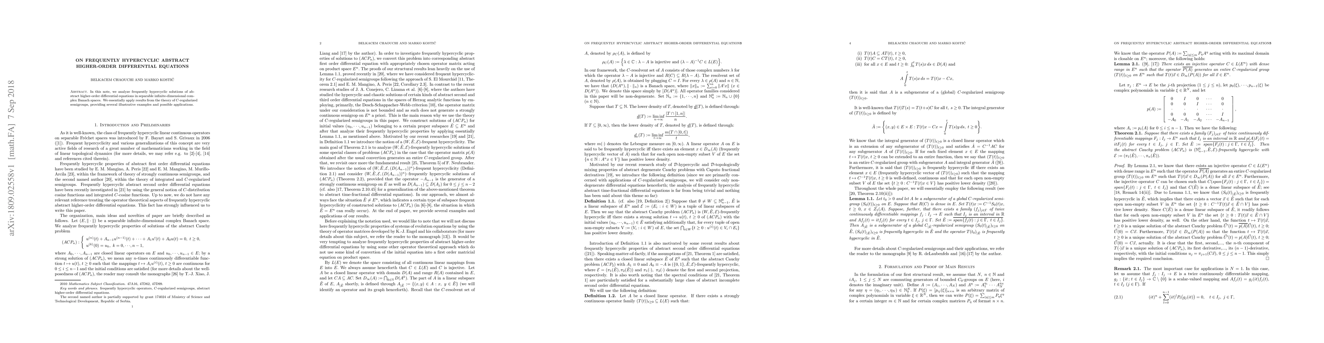 This paper explores frequently hypercyclic solutions of abstract higher-order differential equations in complex Banach spaces, utilizing $C$-regularized semigroups and offering examples and potential applications.