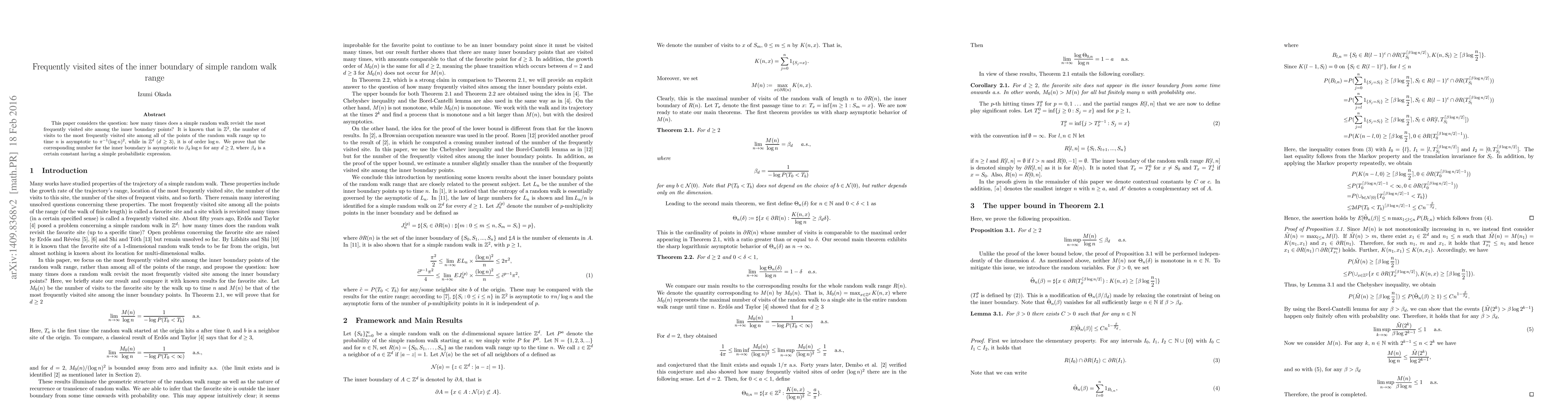 A random walk's inner boundary points are analyzed for repeated visits to the most frequently visited site; the frequency is found to be asymptotic to β_d log n for d ≥ 2.