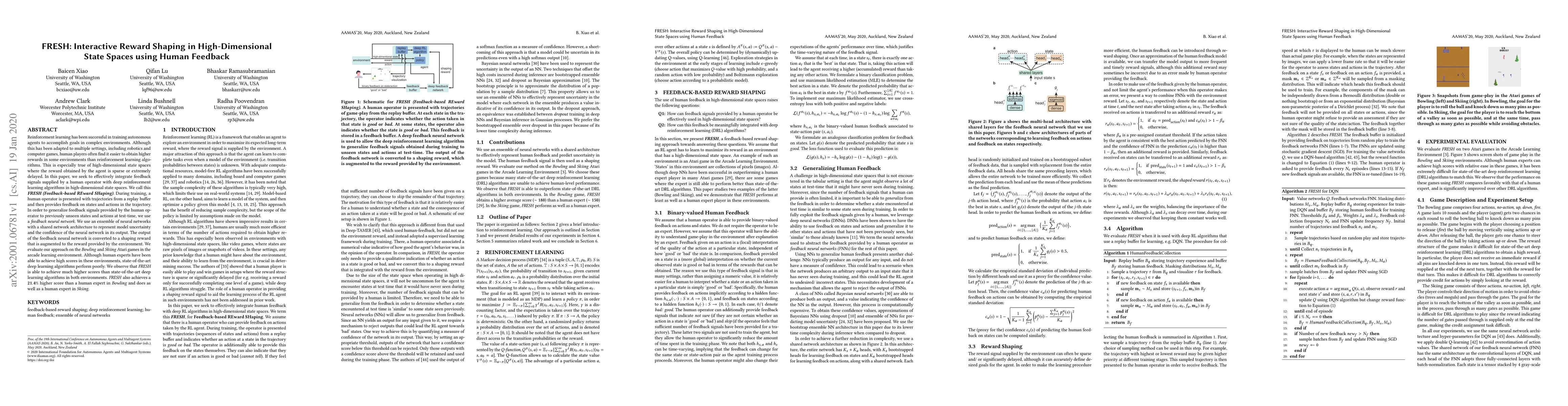 FRESH integrates human feedback with deep reinforcement learning to improve agent performance in high-dimensional state spaces, achieving higher scores than state-of-the-art algorithms in Atari games like Bowling and Skiing. The method uses a feedback neural network to generalize human-provided signals and augments the agent's reward function accordingly.