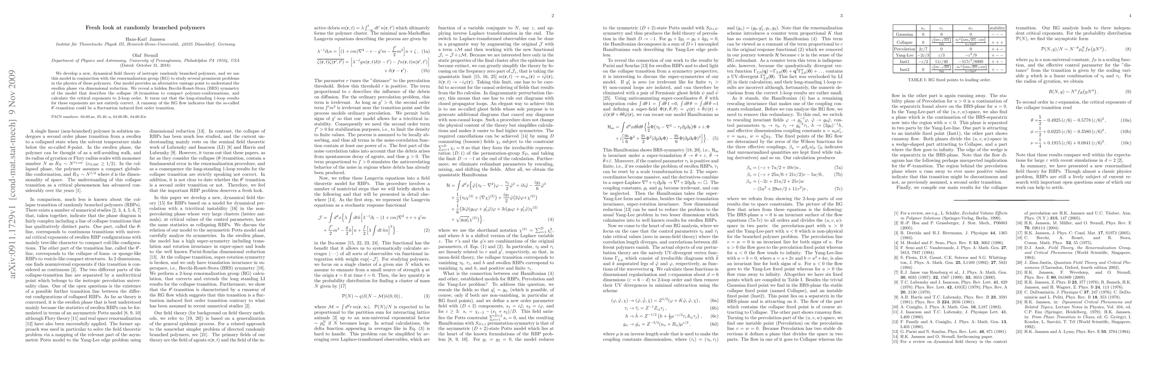 We develop a new, dynamical field theory of isotropic randomly branched polymers, and we use this model in conjunction with the renormalization group (RG) to study several prominent problems in the physics of these polymers. Our model provides an alternative vantage point to understand the swollen phase via dimensional reduction. We reveal a hidden Becchi-Rouet-Stora (BRS) symmetry of the model that describes the collapse ($\theta$-)transition to compact polymer-conformations, and calculate the critical exponents to 2-loop order. It turns out that the long-standing 1-loop results for these exponents are not entirely correct. A runaway of the RG flow indicates that the so-called $\theta^\prime$-transition could be a fluctuation induced first order transition.