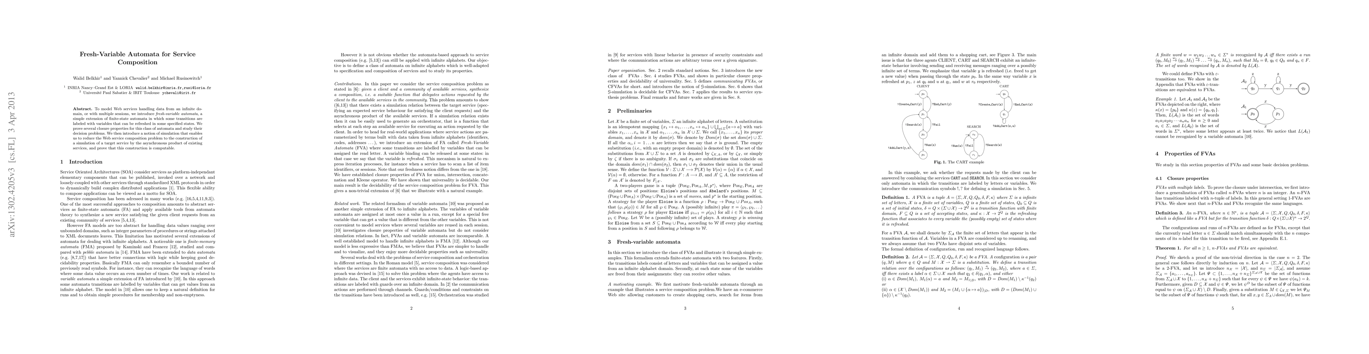 To model Web services handling data from an infinite domain, or with multiple sessions, we introduce fresh-variable automata, a simple extension of finite-state automata in which some transitions are labeled with variables that can be refreshed in some specified states. We prove several closure properties for this class of automata and study their decision problems. We then introduce a notion of simulation that enables us to reduce the Web service composition problem to the construction of a simulation of a target service by the asynchronous product of existing services, and prove that this construction is computable.