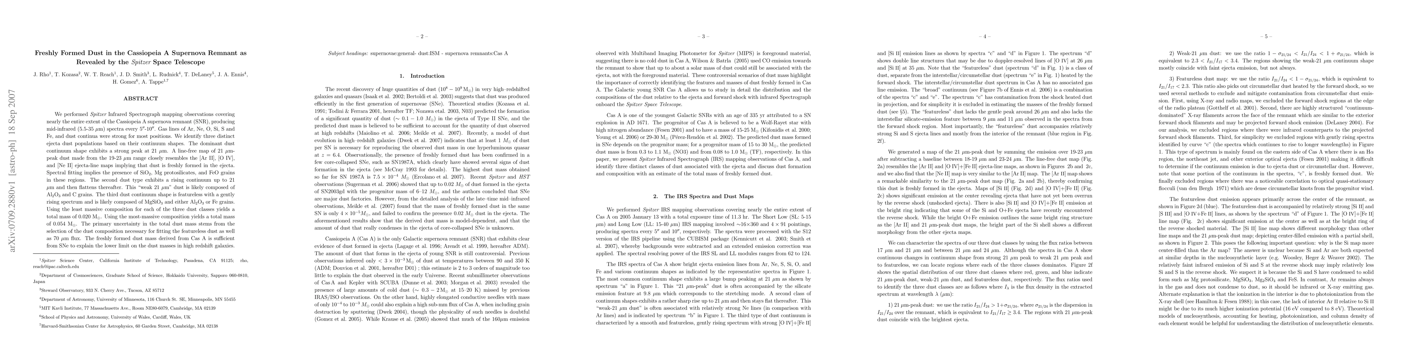 We performed Spitzer Infrared Spectrograph mapping observations covering nearly the entire extent of the Cassiopeia A supernova remnant (SNR), producing mid-infrared (5.5-35 micron) spectra every 5-10". Gas lines of Ar, Ne, O, Si, S and Fe, and dust continua were strong for most positions. We identify three distinct ejecta dust populations based on their continuum shapes. The dominant dust continuum shape exhibits a strong peak at 21 micron. A line-free map of 21 micron-peak dust made from the 19-23 micron range closely resembles the [Ar II], [O IV], and [Ne II] ejecta-line maps implying that dust is freshly formed in the ejecta. Spectral fitting implies the presence of SiO2, Mg protosilicates, and FeO grains in these regions. The second dust type exhibits a rising continuum up to 21 micron and then flattens thereafter. This ``weak 21 micron'' dust is likely composed of Al2O3 and C grains. The third dust continuum shape is featureless with a gently rising spectrum and is likely composed of MgSiO3 and either Al2O3 or Fe grains. Using the least massive composition for each of the three dust classes yields a total mass of 0.02 Msun. Using the most-massive composition yields a total mass of 0.054 Msun. The primary uncertainty in the total dust mass stems from the selection of the dust composition necessary for fitting the featureless dust as well as 70 micron flux. The freshly formed dust mass derived from Cas A is sufficient from SNe to explain the lower limit on the dust masses in high redshift galaxies.