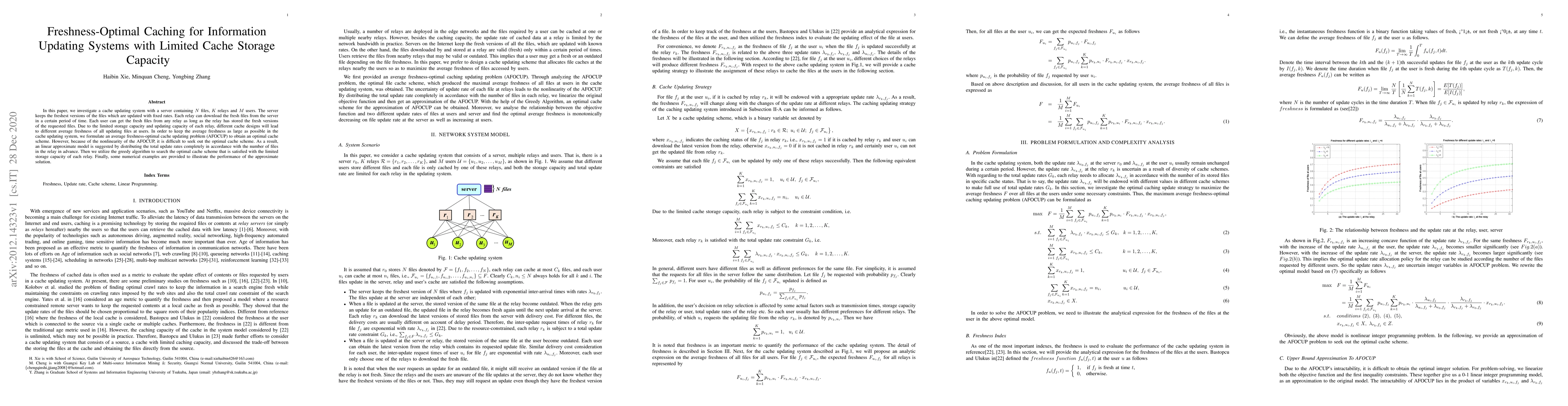 The paper proposes a cache updating system model with a server, K relays, and M users. It formulates an average freshness-optimal caching updating problem (AFOCUP) to maximize the average freshness of files at users, but due to its nonlinearity, suggests a linear approximation model using a greedy algorithm to find an optimal cache scheme.