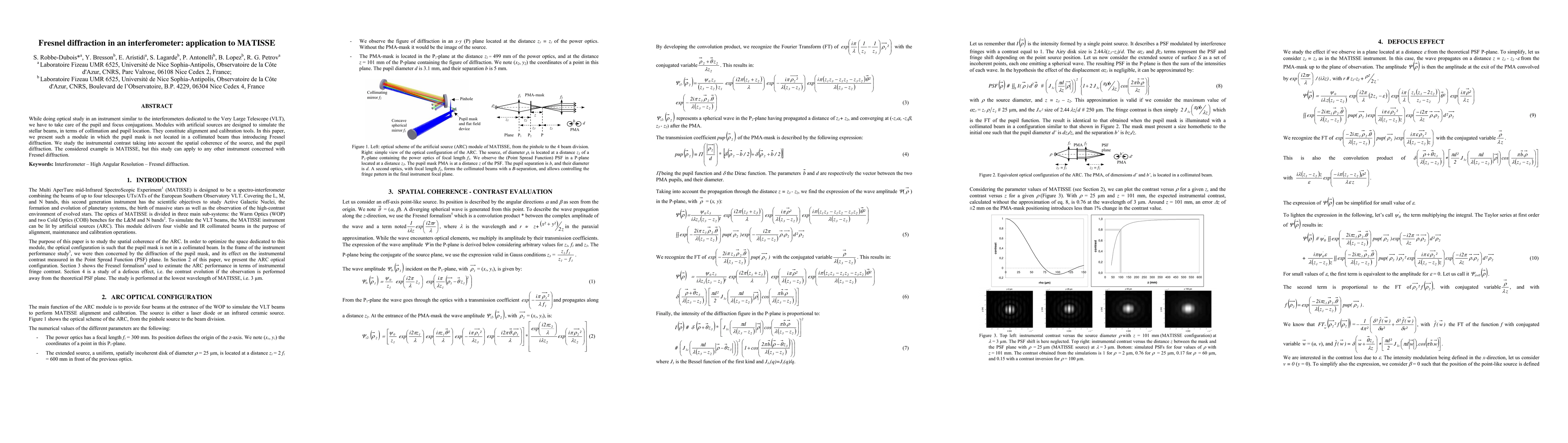 The paper presents detailed mathematical derivations and expressions for Fresnel diffraction in an interferometer setup, providing a comprehensive analysis of contrast and PSF in such systems.