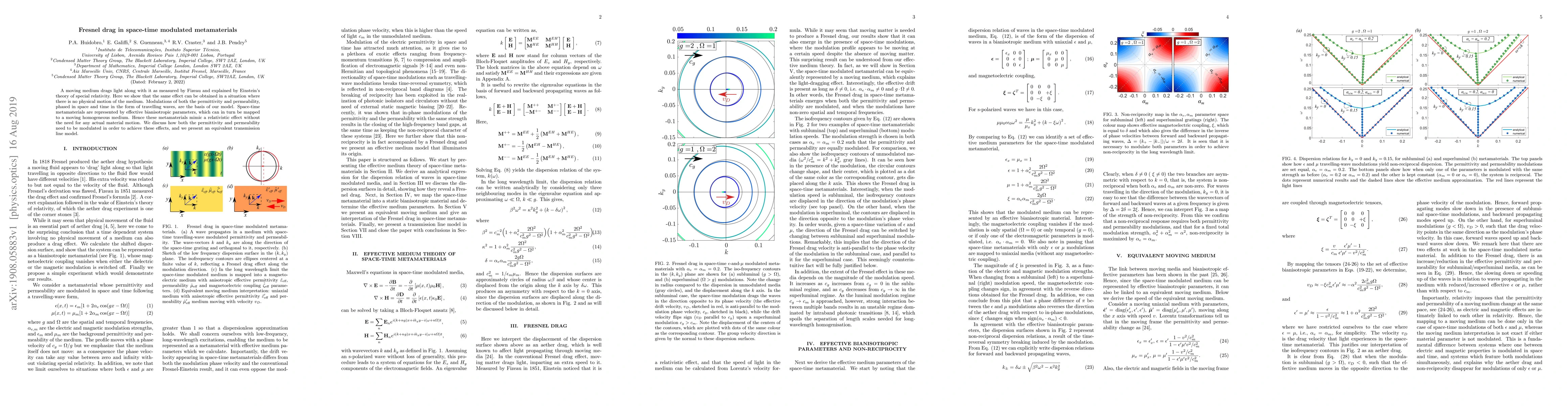 This paper demonstrates that Fresnel drag, a relativistic effect where a moving medium drags light along, can be replicated in space-time modulated metamaterials without actual material motion. The authors use effective bianisotropic parameters to model the modulation of permittivity and permeability, achieving the effect through phased spatial and temporal variations.